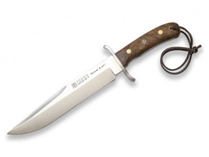 Nagy vadászkés. Penge anyaga Böhler N695 acél. A penge hossza 24 cm, az összhossz 36,5 cm. Markolata diófa. Bőr tok.