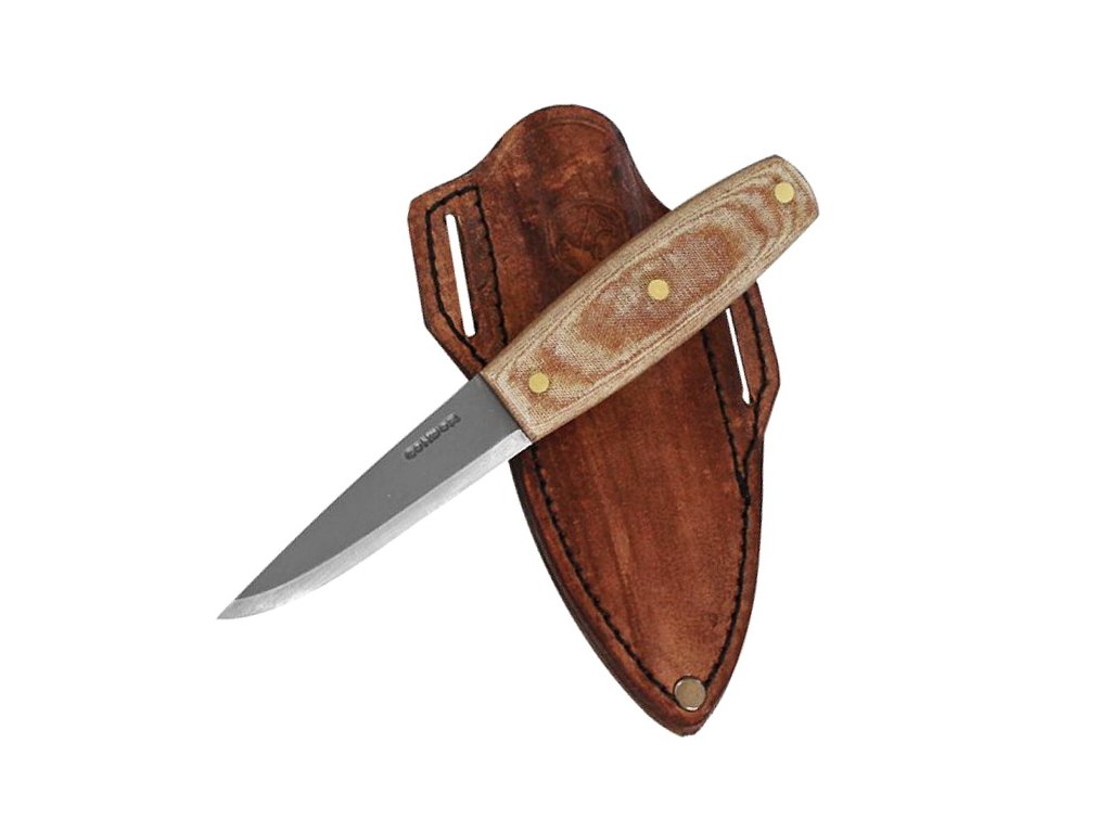 Közepes méretű kés a természetbe. A kés 1075 magas széntartalmú acélból készült, és micarta markolattal rendelkezik. Nem hagyományos formájú övre kapcsolható bőrtok.
