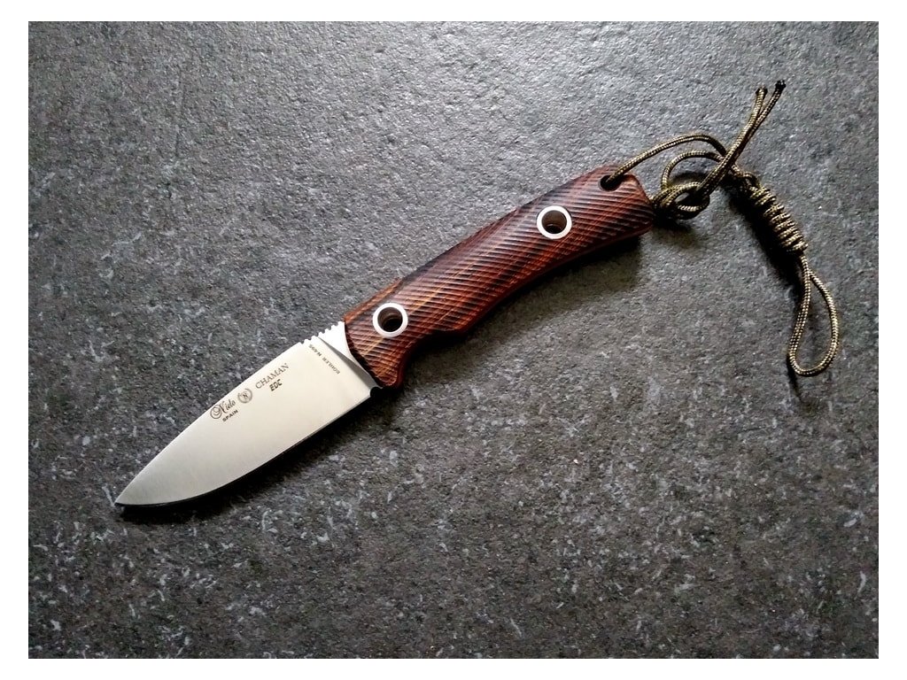 A Chaman EDC modell a Miguel Nieto 2018-as újdonsága. Kiváló minőségű, kisebb méretű kés, alkalmas természetbe, vadászatra vagy túrázáshoz. A full tang konstrukció garantálja erejét és megbízhatóságát. A penge hossza 8,9 cm, lapos leélezésssel és Böhler N695minőségi acélból készült. Markolata egzotikuscocobolo fa amely enyhén gerezdes és nagyon jó fogást biztosít. Minőségi kidolgozású barna marhabőr tok. A kés kompatilis a tűzgyújtóval.