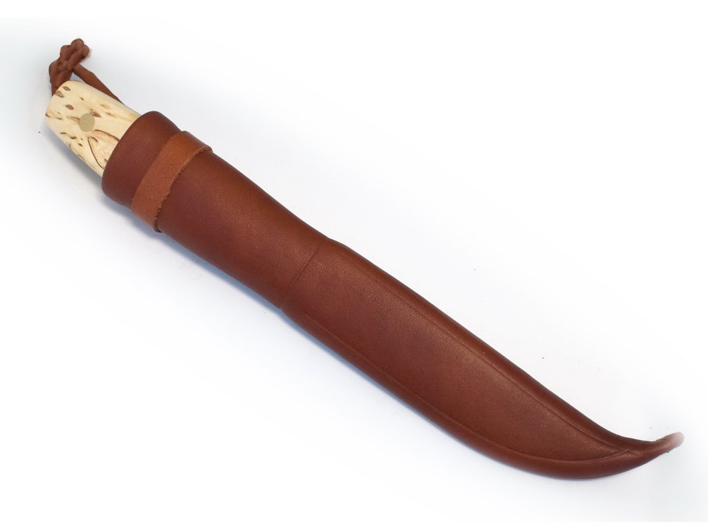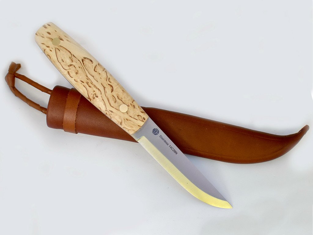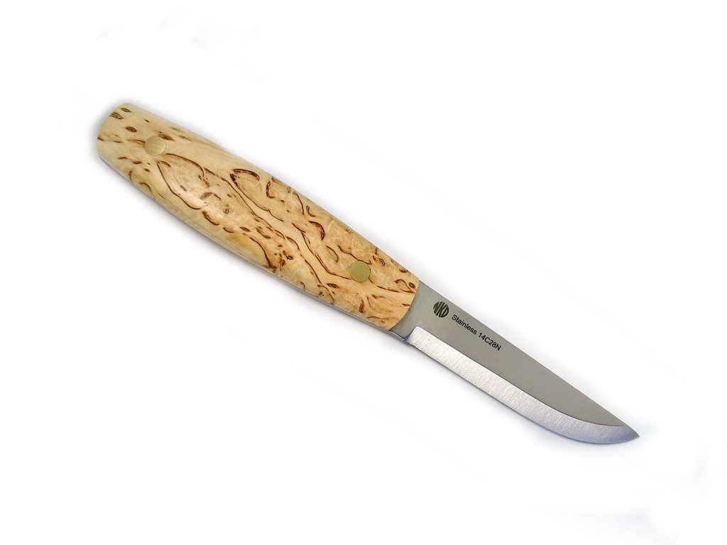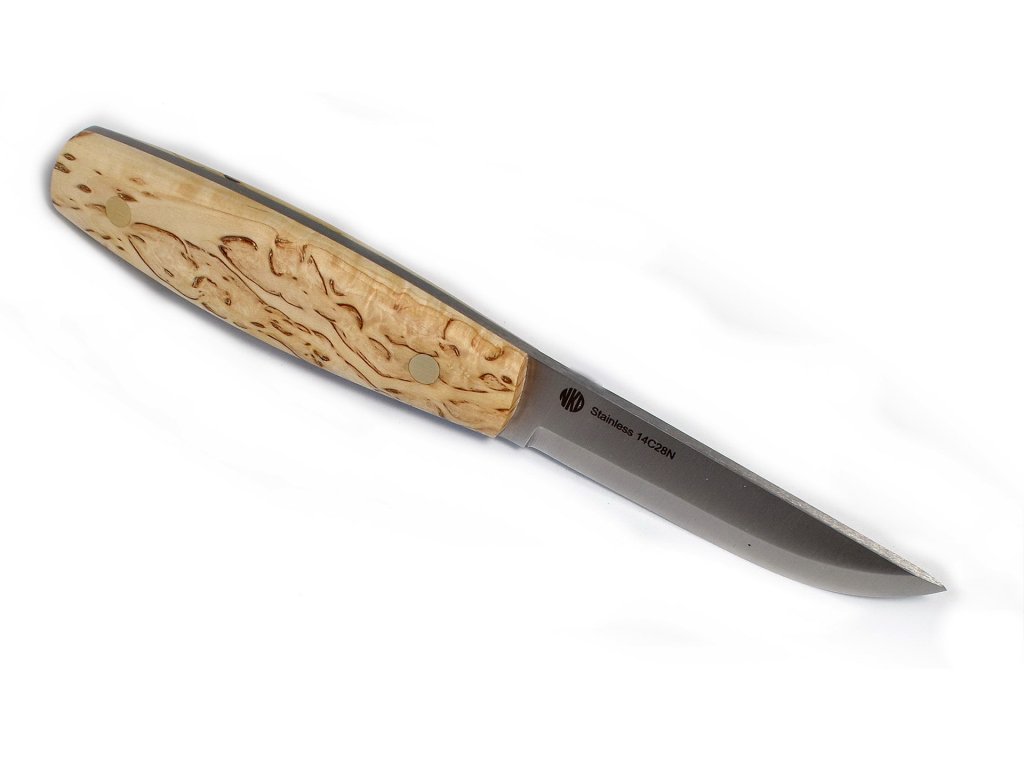 A Nordic Knife Design Korpi egy sokoldalú, rögzített pengéjű kés túrázáshoz, utazáshoz, mindennapi szállításhoz vagy kisebb fogások feldolgozásához. A penge 9,3 cm hosszú, Sandvik 14C28N rozsdamentes acélból készült skandináv élezésű. A göndör nyírfa nyél kellemes tapintású. Bőr tok spanyol természetes cserzett marhabőrből.