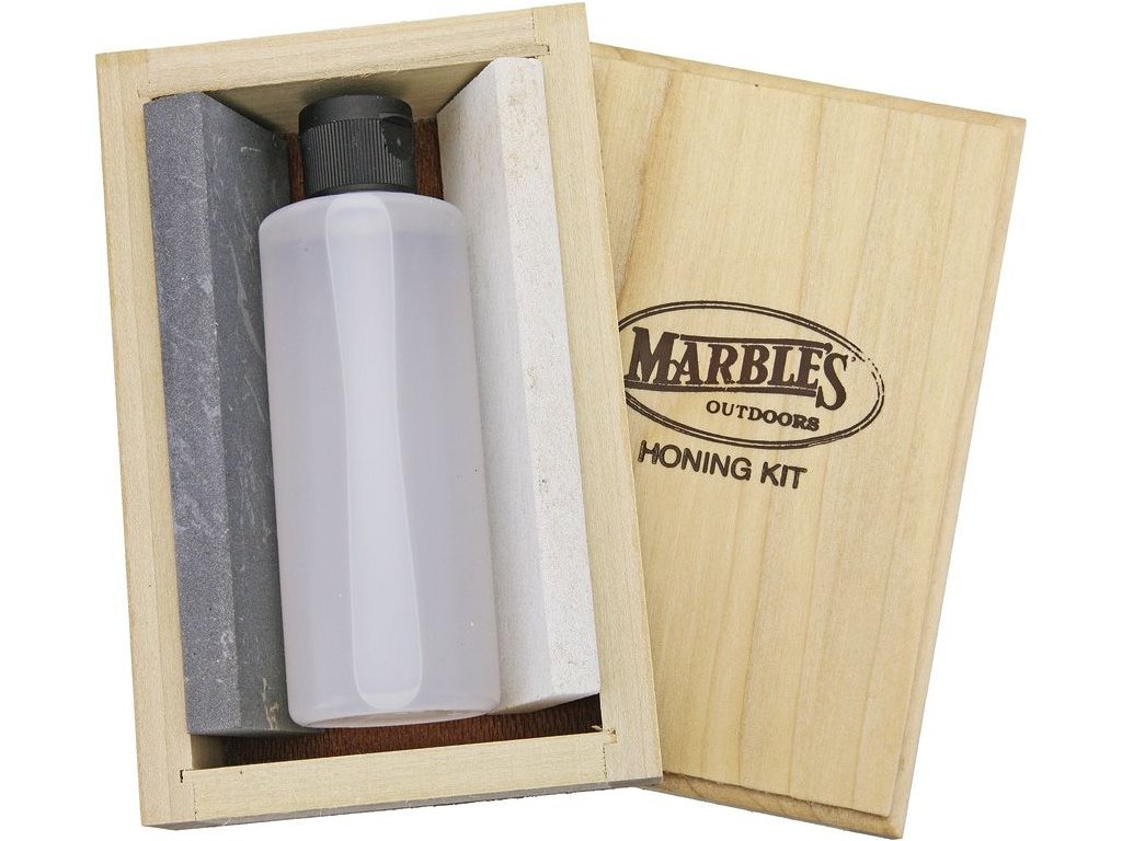 A késélező készlet 2 db különböző szemcseméretű (közepes és finom) Arkansas közepes élezőkövet, élezőolajat és egy Marbles logóval ellátott fa tárolódobozt tartalmaz. Az élezőkövek finom és durva élezésre egyaránt használhatók.