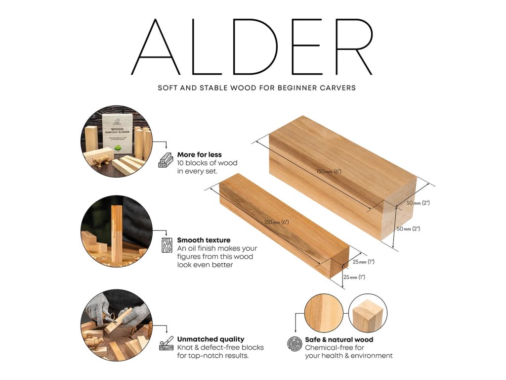 Faragáshoz való égerfa készlet, két különböző méretben, összesen 10 darab. Az égerfa könnyű és puha, ugyanakkor erős. Nagyon könnyen megmunkálható, és lágysága és jó megmunkálhatósága miatt kiválóan alkalmas faragásra. Az égerfa színe eleinte fehér, majd idővel narancssárgától halványvörösig változik.