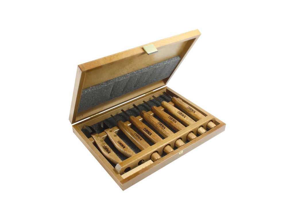 8 darabos faragó szerszámkészlet kisméretű faragáshoz. A teljes készletet fadobozban szállítjuk. A készlet 824018, 824112, 824213, 824314, 824415, 824514 vésőket és 822510, 822520 késeket tartalmaz.