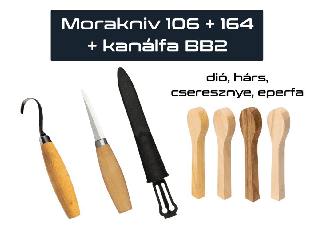 Mora 164 faragókés, ún. kanálfaragó. Kifejezetten kanalak, csanak és más darabok vágására, ahol mélyedést kell vágni a fába. 57-58 HRC keménységű rozsdamentes acél penge. Nyírfa markolata, tipikus hordó alakú. A 164-es modell van a legjobban behajlítva (körátmérője megközelítőleg 1,3 cm), kétoldalas pengével rendelkezik. A Morakniv késeket Svédországban gyártják.