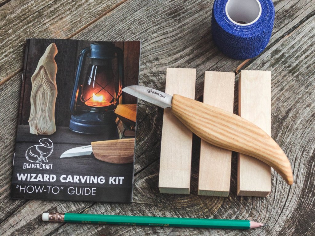 Fafaragó készlet kezdőknek, amely szórakozást kínál gyerekeknek, felnőtteknek és az egész családnak. Ez a kezdőkészlet egy Beavercraft C2 erős > faragáshoz, varázsló figura készítésének útmutatója és 3 db hársfa faragáshoz.