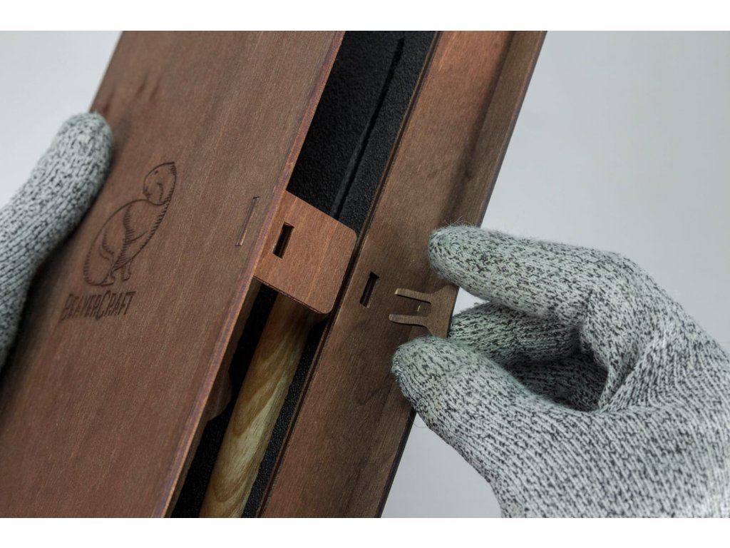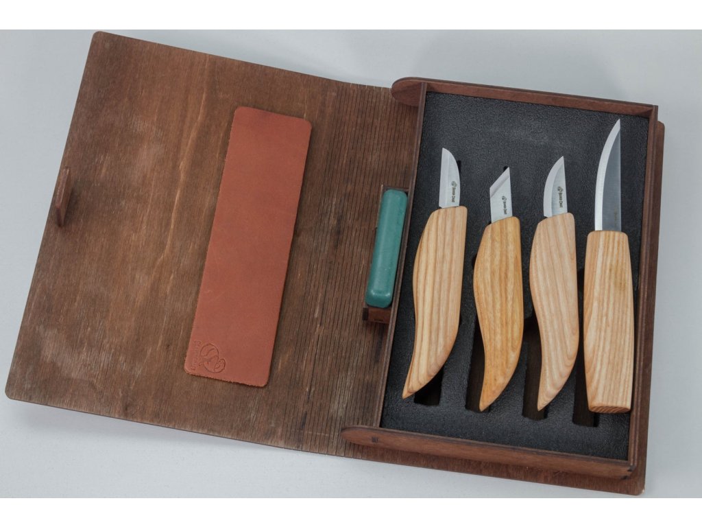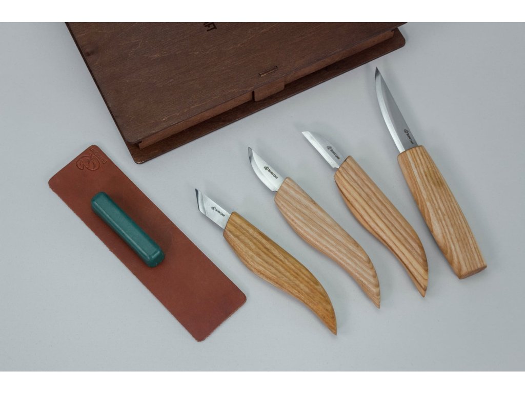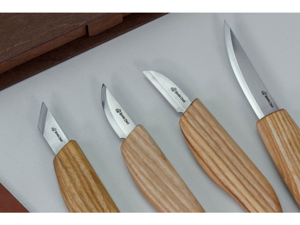 Négy alaptípusú BeaverCraft faragó késből álló univerzális készlet egy elegáns fa díszdobozban, könyv formájában. A kések nagyon élesek, és a kapott vágás olyan sima, a fa repedései nélkül. 57 - 59 HRC keménységig edzett szénacél pengék. A szénacél jól tartja a szélét, könnyen élezhető, de hajlamosabb a rozsdásodásra (a kést használat után alaposan meg kell tisztítani és meg kell szárítani, a pengét is érdemes időnként átkenni olajjal). Kőrisfa markolatk, lenolajjal átitatva.