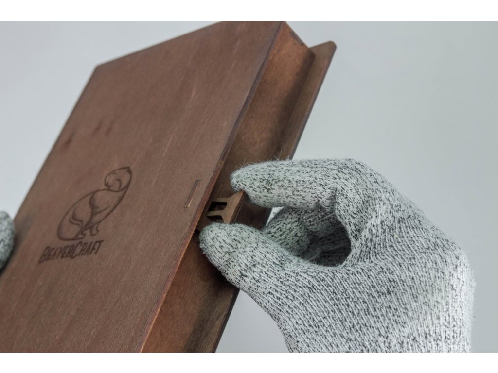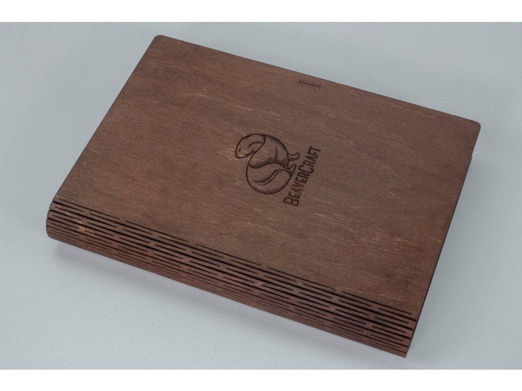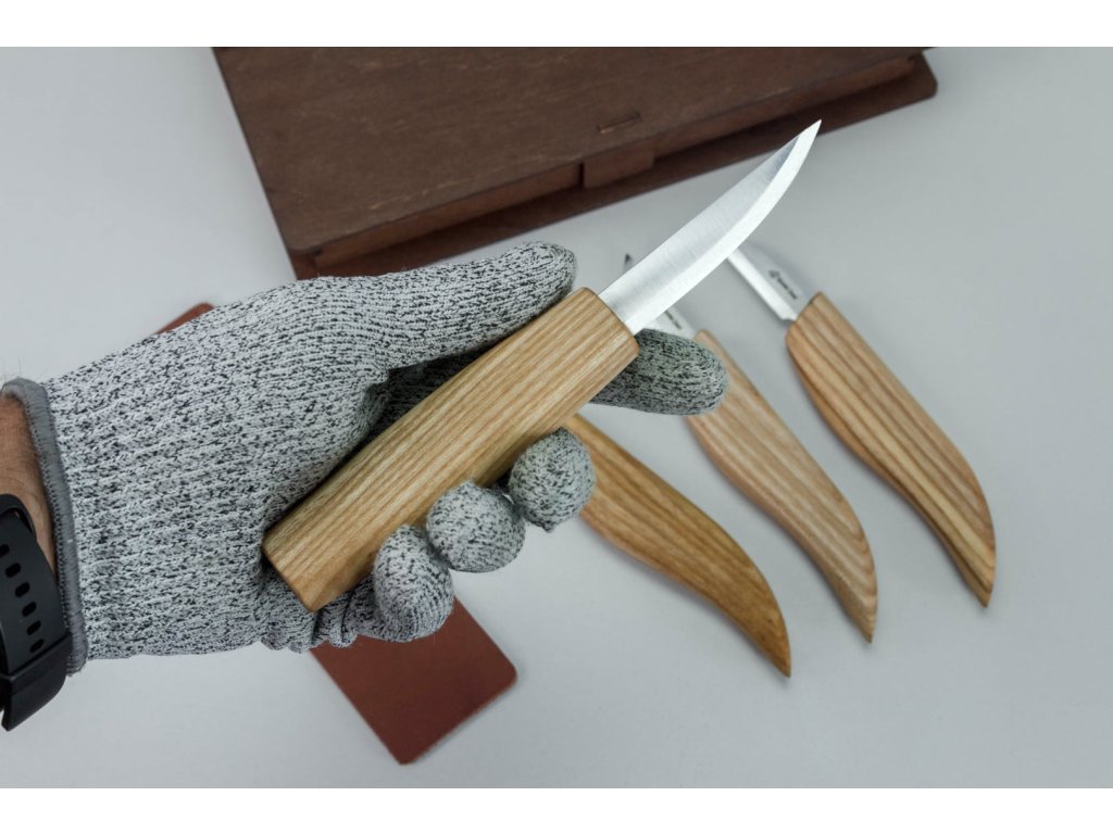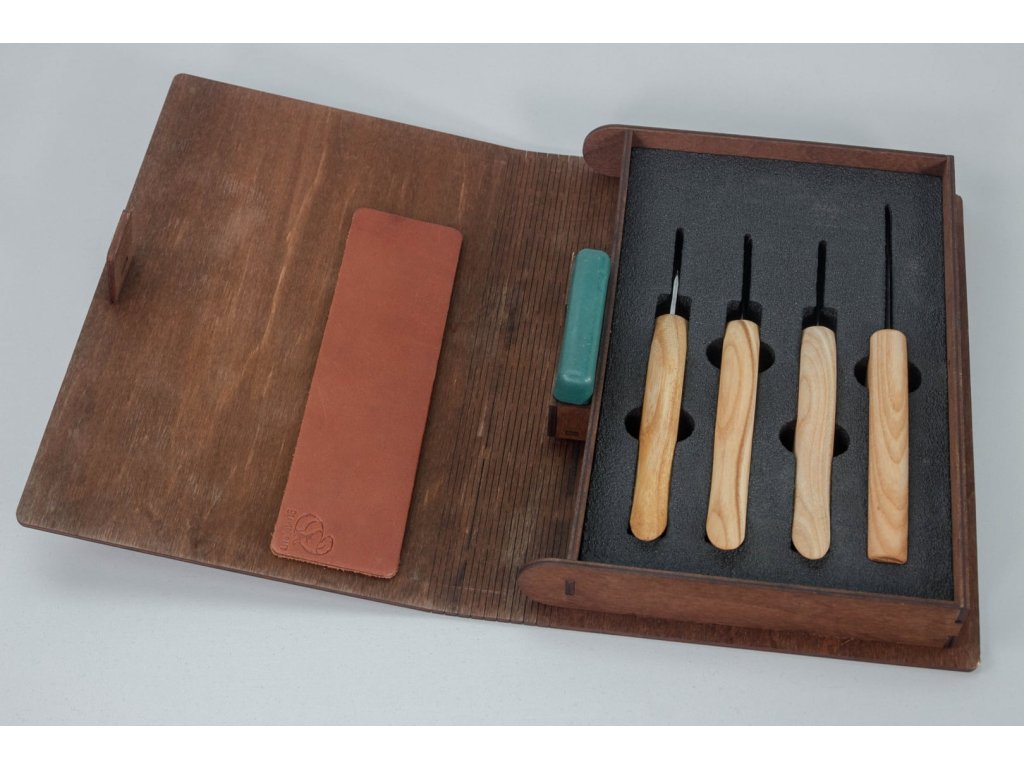 Négy alaptípusú BeaverCraft faragó késből álló univerzális készlet egy elegáns fa díszdobozban, könyv formájában. A kések nagyon élesek, és a kapott vágás olyan sima, a fa repedései nélkül. 57 - 59 HRC keménységig edzett szénacél pengék. A szénacél jól tartja a szélét, könnyen élezhető, de hajlamosabb a rozsdásodásra (a kést használat után alaposan meg kell tisztítani és meg kell szárítani, a pengét is érdemes időnként átkenni olajjal). Kőrisfa markolatk, lenolajjal átitatva.