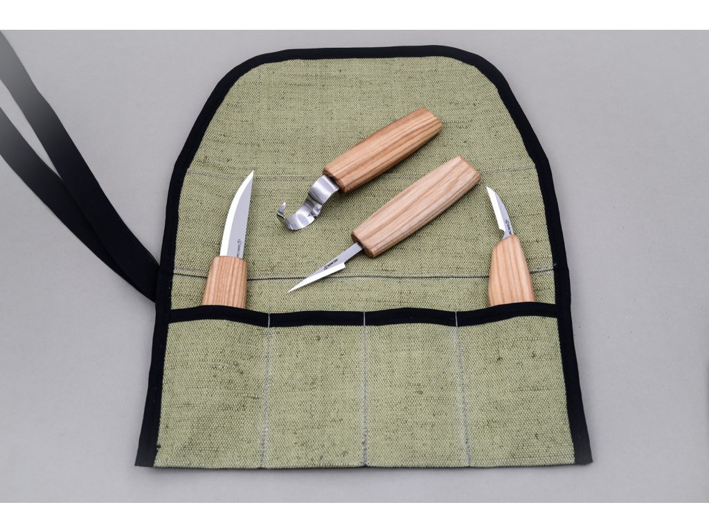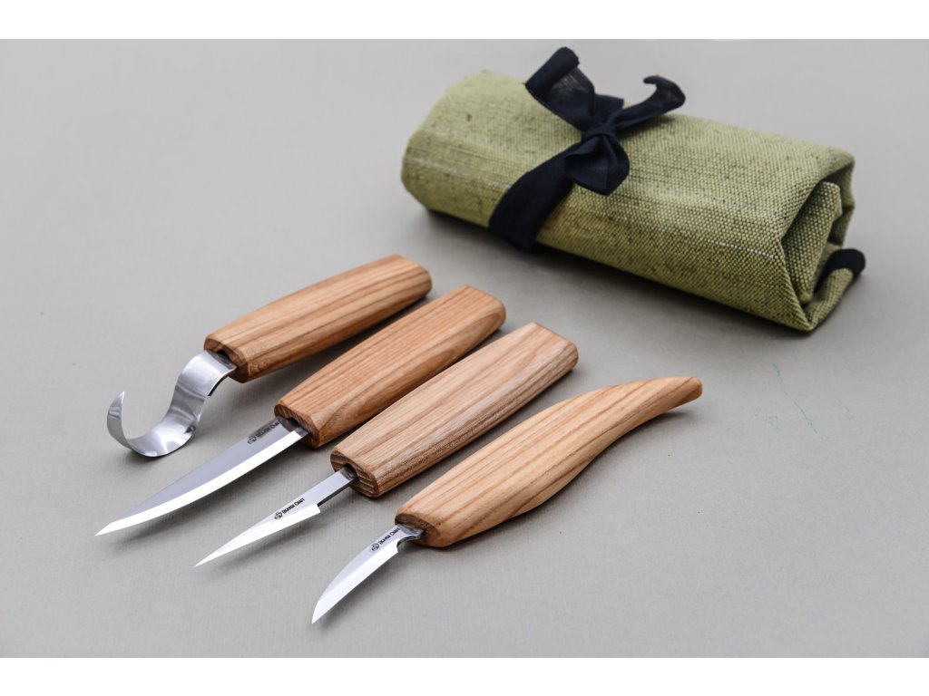 Univerzális készlet négyféle BeaverCraft faragó késből, illetve kanálfaragó kés kanalak, tányérok faragásához. A kések nagyon élesek, és a kapott vágás nagyon finom, fa sérülése nélkül. 57 - 59 HRC keménységig edzett szénacél pengék. A szénacél sokáig éles és könnyen csiszolható, de inkább rozsdásodásra hajlamos (a kést használat után alaposan meg kell tisztítani és szárítani, a pengét is érdemes időnként olajjal áttörölni). Lenolajjal impregnált kőrisfa nyél. Vászontokba csomagolva.
