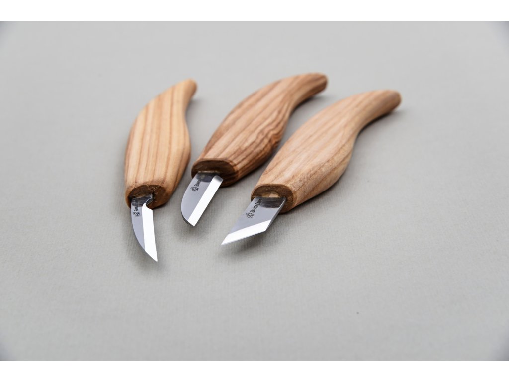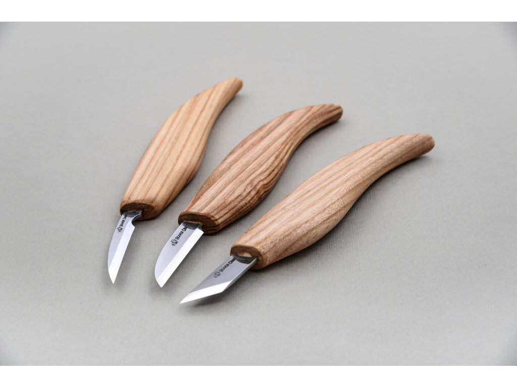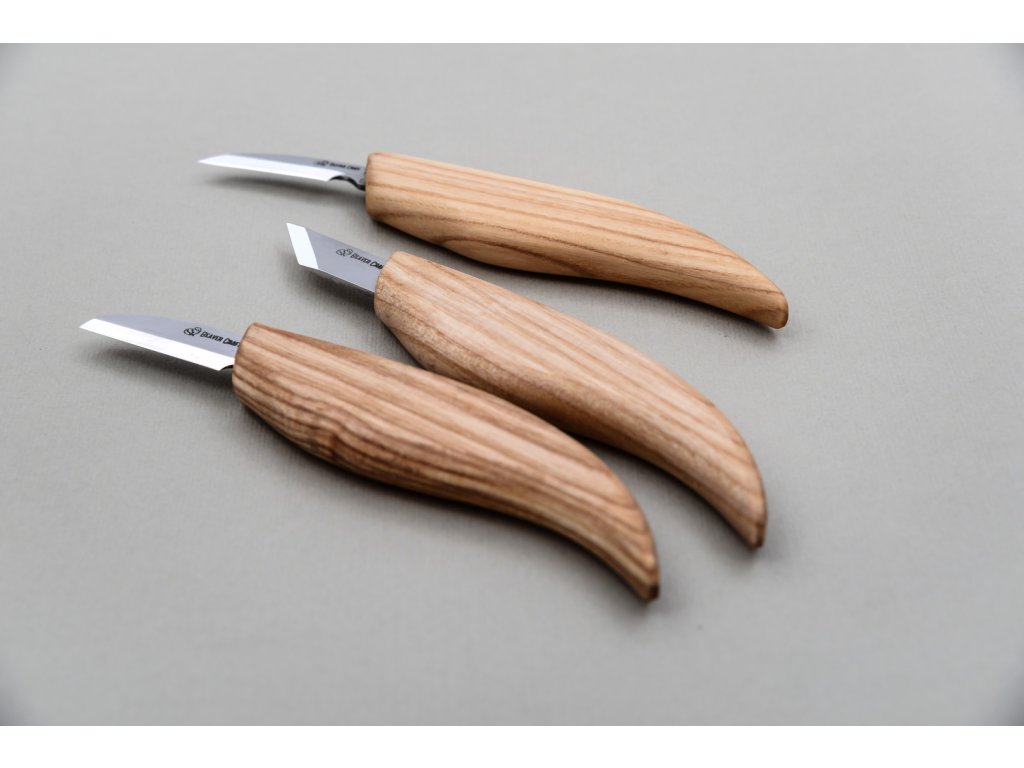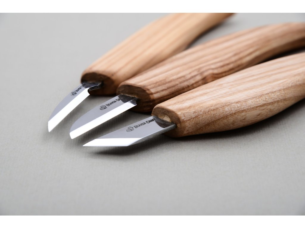 Három BeaverCraft faragó késből álló univerzális készlet. A kések nagyon élesek, és a kapott vágás nagyon finom, fa sérülése nélkül. 57 - 59 HRC keménységig edzett szénacél pengék. A szénacél sokáig éles és könnyen csiszolható, de inkább rozsdásodásra hajlamos (a kést használat után alaposan meg kell tisztítani és szárítani, a pengét is érdemes időnként olajjal áttörölni). Lenolajjal impregnált kőrisfa nyéllel.