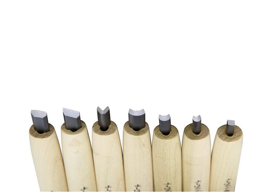 Egy hétrészes japán Yoshiharu faragó késkészlet. A pengék kétrétegű szénacélból készülnek. Az alsó réteg (penge) kemény szénacélból készül, ami törékeny. A lágy acél felső rétege biztosítja a késeknek a szükséges tartósságot. A szénacél penge sokáig éles marad, könnyen élezhető, de nagyon hajlamos a rozsdásodásra (a kést használat után alaposan meg kell tisztítani, meg kell szárítani és olajozni kell). Fa markolatk. Japánban készült.