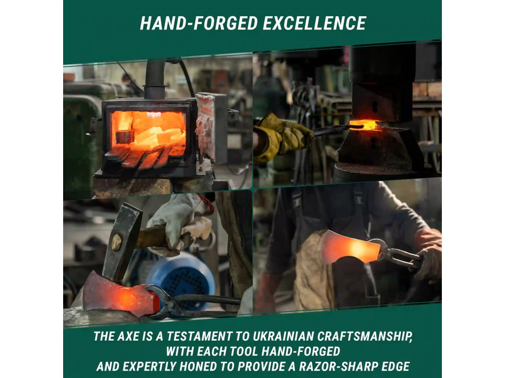 A szekerce feje kézzel kovácsolt 65G szénacélból készült, ami egyedi kialakítást eredményez. A fejsze gyárilag nagyon éles, domború élezéssel rendelkezik, és azonnal használatra kész. A lekerekített, széles, 11,8 cm hosszúságú penge mély vágásokat tesz lehetővé a fába, ami nagyban megkönnyíti a munkát.