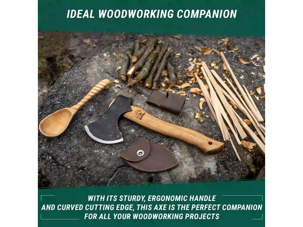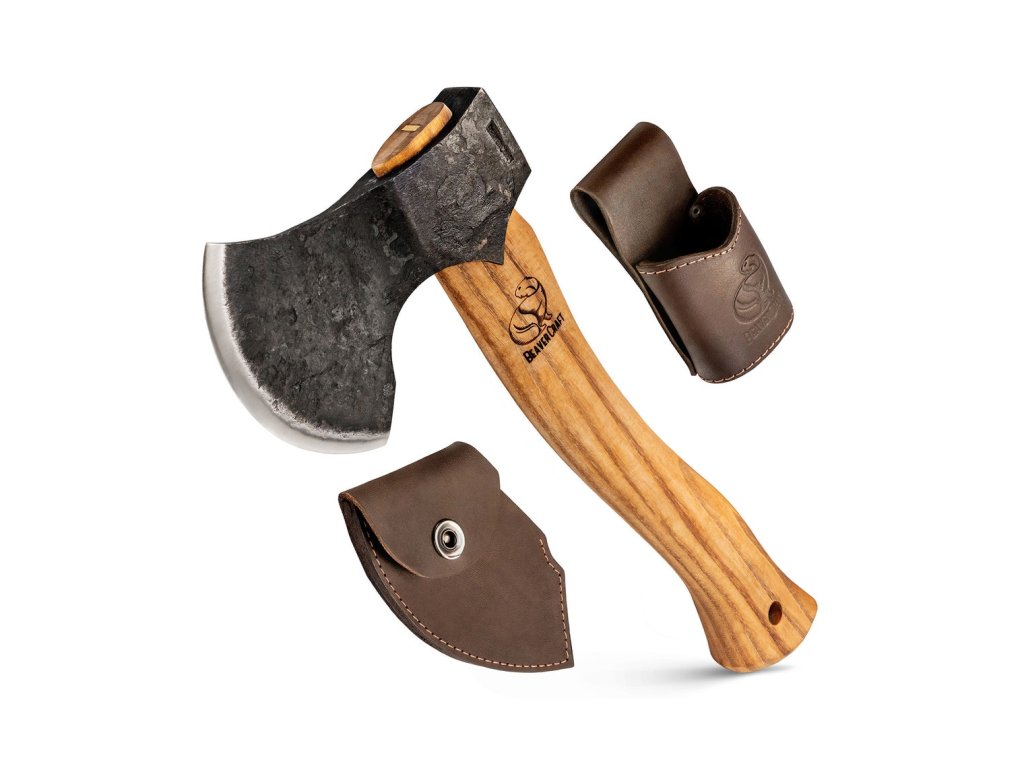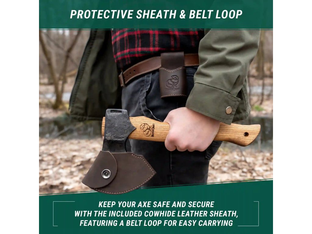 A fejszéhez valódi bőrből készült pengevédő és övhurok tartozik. A huroknak köszönhetően a fejszét az övén lógva hordhatja.