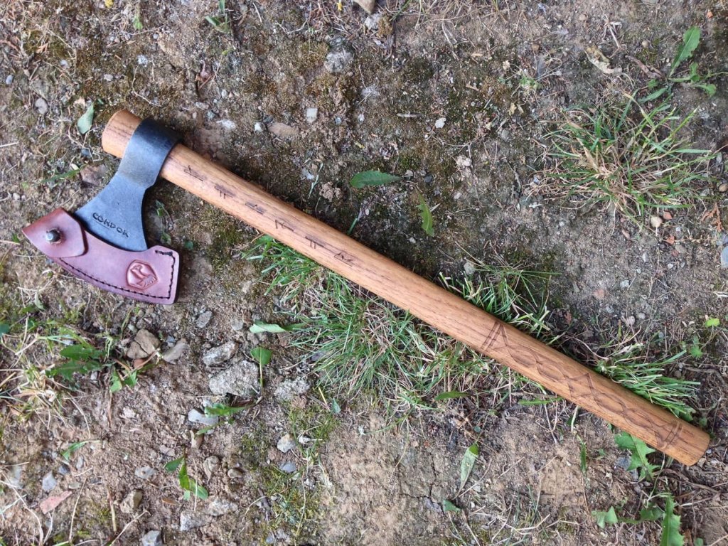 A Condor Valhalla dobóbalta 1060 szénacélból készül, keménysége 50-55 HRC. A fejsze feje kézzel kovácsolt, ami nagyon szép felületet és klasszikus megjelenést kölcsönöz a baltának. A cserzett amerikai hikkori fából készült nyél nagyon erős, és a viking dizájnnal kombinálva ősi megjelenést kölcsönöz a baltának. A tok-pengevédő kiváló minőségű, kézzel készített barna bőrből készült.