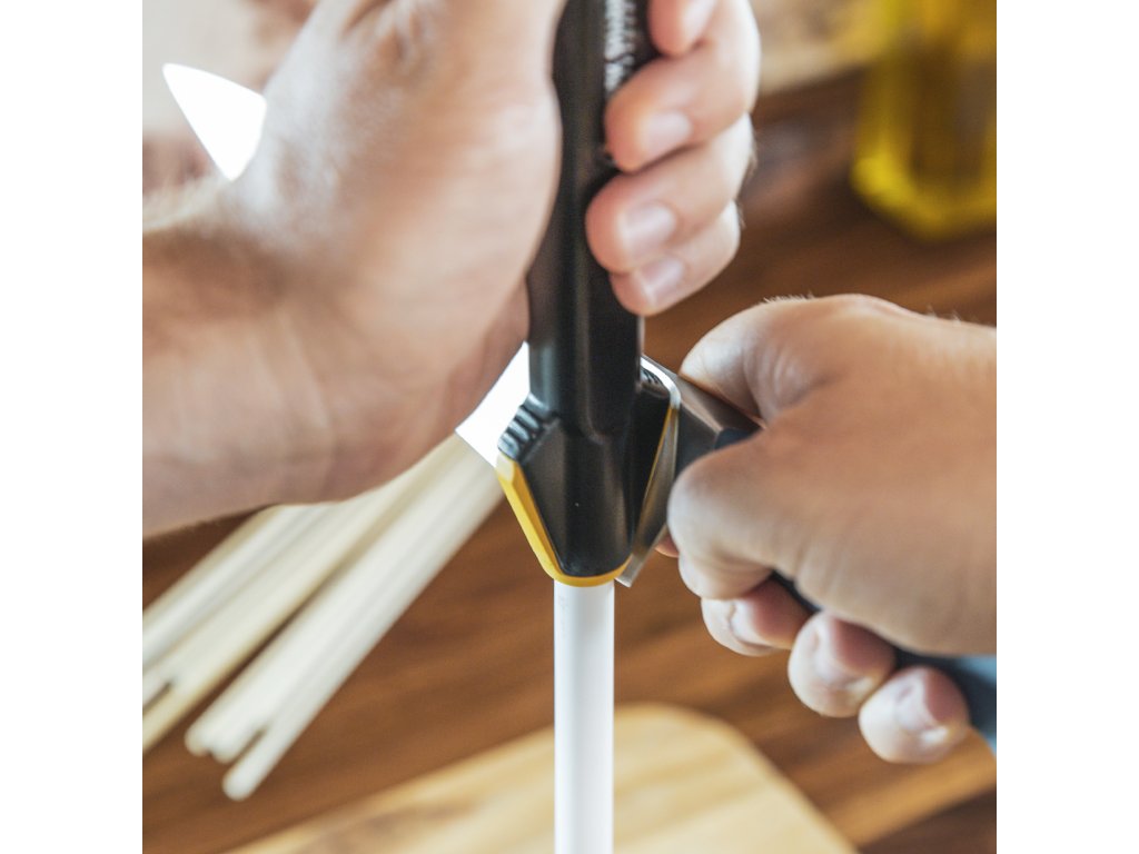 Kerámia élező (csiszoló rúd) kerek formával. A csiszoló rész fehér kerámiából készült. A finom kerámiafelület kis mennyiségű anyagot távolít el, hogy a vágóél újra élesre csiszolja a kést. A kerámia rúd gumi hegyét helyezze a munkapadjára a biztonságos és stabil élezés érdekében. Az élezőrész mérete 23,3 cm. Lanyard lyuk a fogantyún