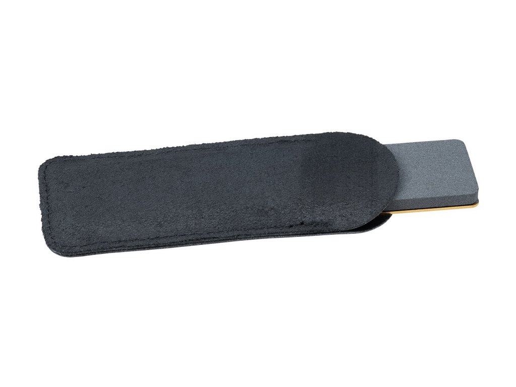 Zseb gyémánt és kerámia fenőkő, vészélezéshez a természetben. Két különböző szemcseméret, egy arany gyémánt kő - szemcseméret 25 mikron és egy sötét szintetikus zafír kő - szemcseméret 5 mikron. A bőr tok használható a penge élezés utáni simítására (csiszolópasztával vagy anélkül).
