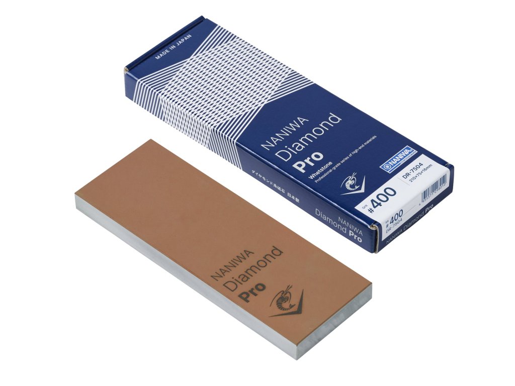 A Naniwa Diamond Pro – 400 grit gyémánt fenőkő akár 1 mm vastag gyémánt szemcsés réteggel rendelkezik, amely gyantával van rögzítve egy masszív fém alapra. Ennek köszönhetően a kő élettartama jelentősen hosszabb, és nincs szükség az egyengetésére. Ez a Naniwa által kínált legdurvább gyémánt fenőkő típus, amely gyorsan és alaposan megélezi a kés pengéjét.