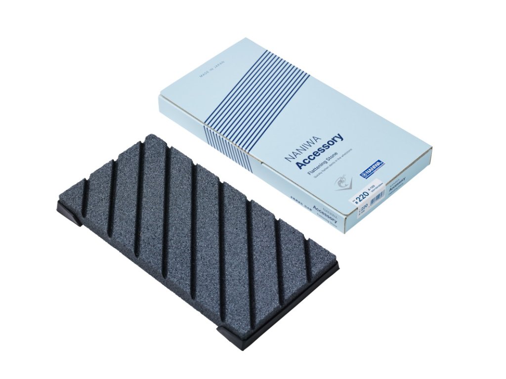 A Naniwa 220 grit szemcseméretű nagy kiegyenlítő fenőkő blokk a fenőkövek felületének síkba hozására szolgál. A kő karborundumból (szilícium-karbid) készült.