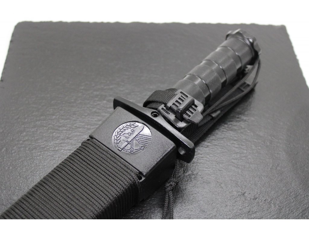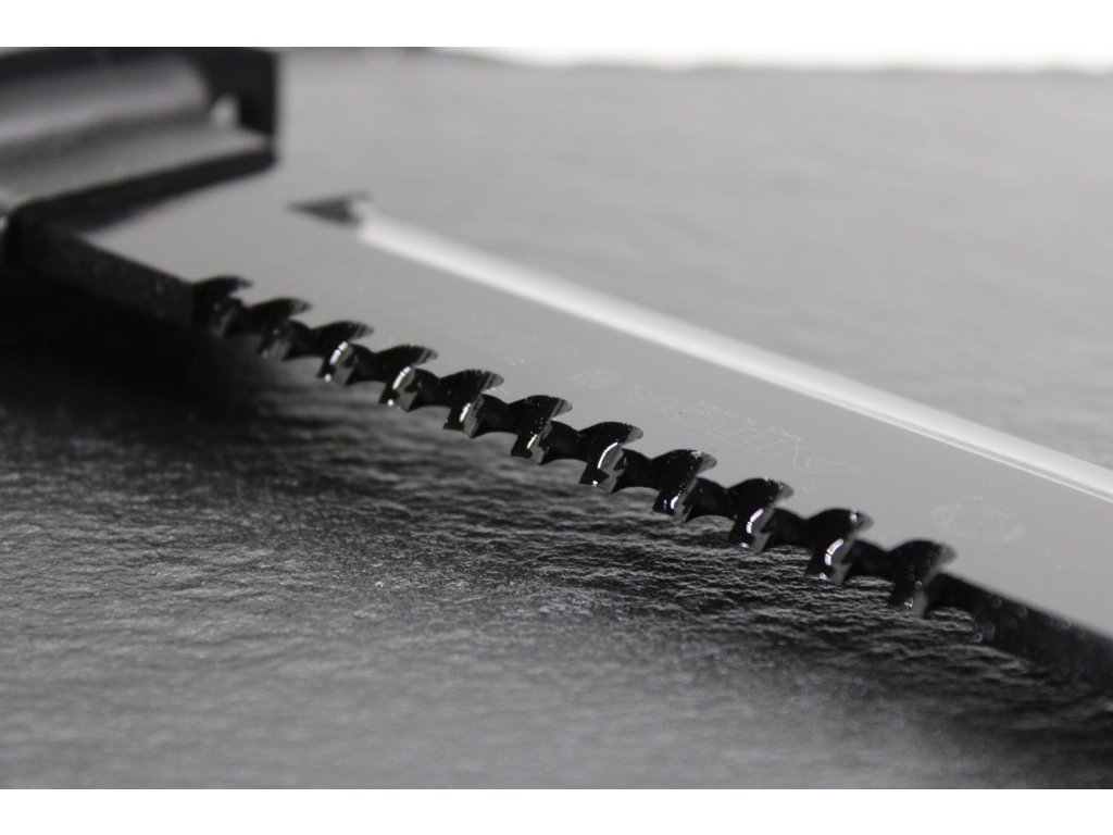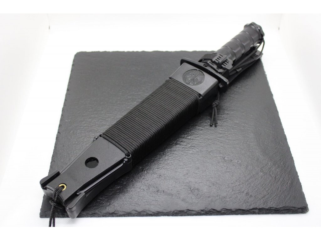A fekete clip point felületű penge CrMoVa rozsdamentes acélból készült acél és 20,5 cm hosszú, 5 mm vastag. Az acél 55/58 HRC keménységre van megeresztve. A kés teljes hossza 36 cm, össztömege 1156 g. A penge hátoldalán kettős fogazat található.