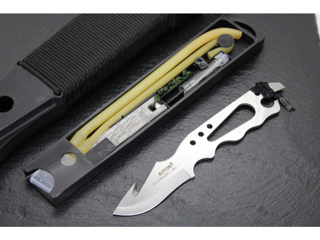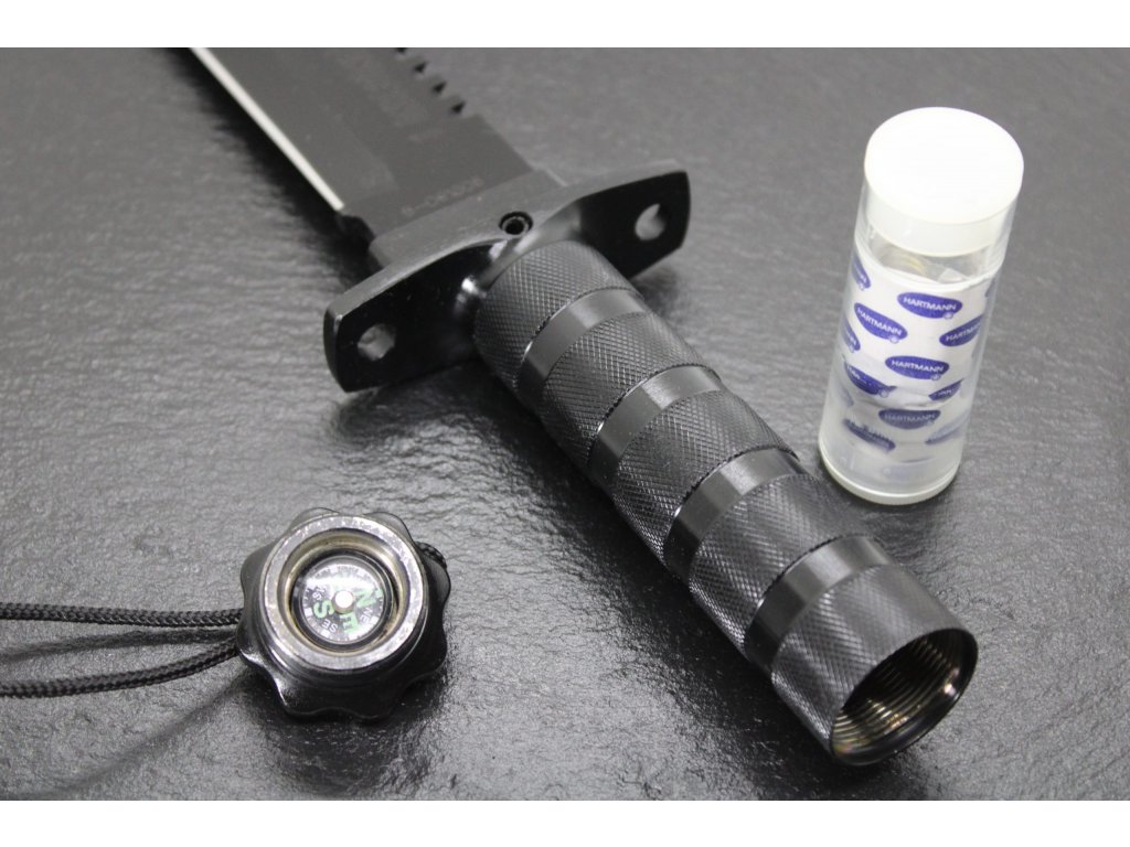 A kés egy mini túlélőkészletet tartalmaz a nyélben és a tokban. A markolat fém kupakja levehető, ami alatt egy praktikus vízálló rekesz rejtőzik, amely kisebb tárgyak vagy túlélési kiegészítők tárolására is alkalmas.