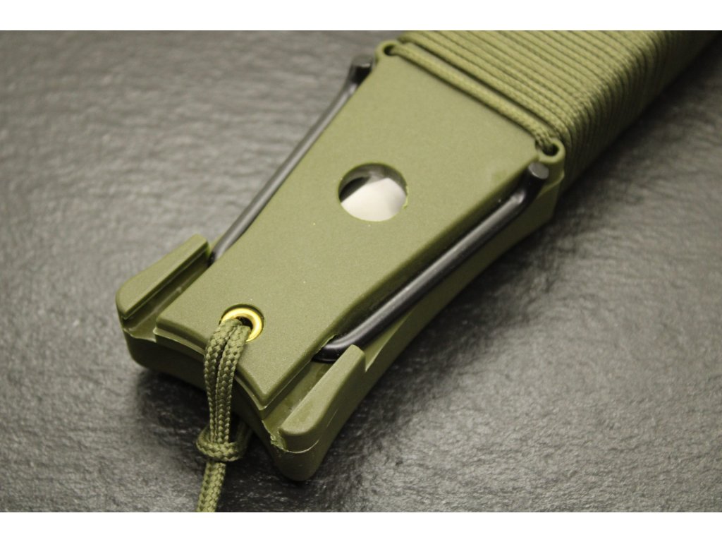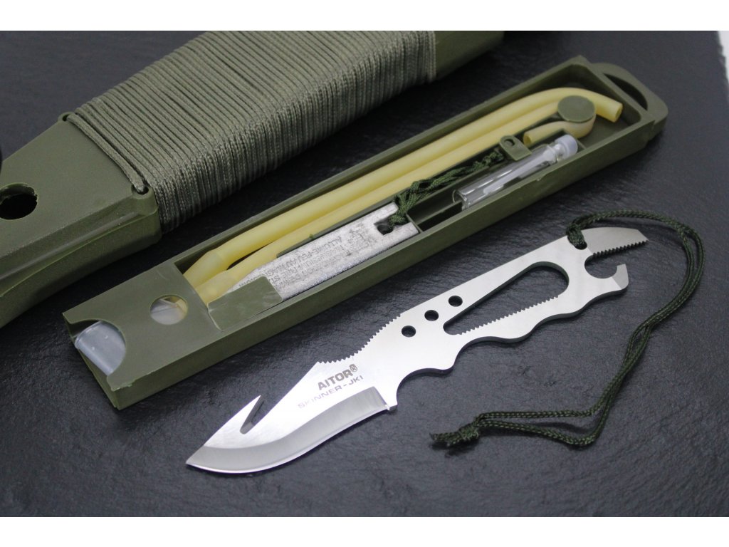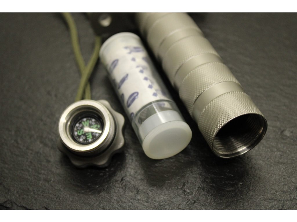 A kés a markolatban és a tokban elrejtett mini túlélőkészletet tartalmaz. A fém markolatsapka levehető, amely alatt egy praktikus vízálló rekesz rejtőzik, amely praktikus kisebb tárgyak vagy túlélési kiegészítők tárolására.