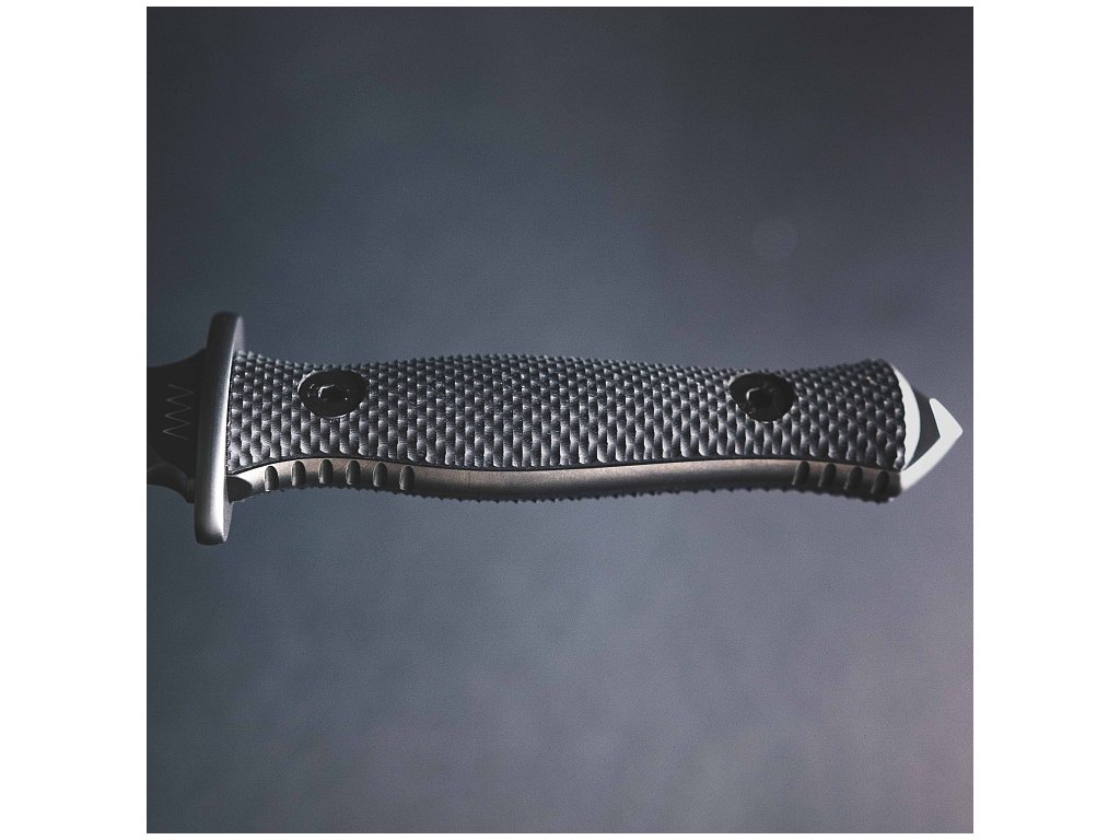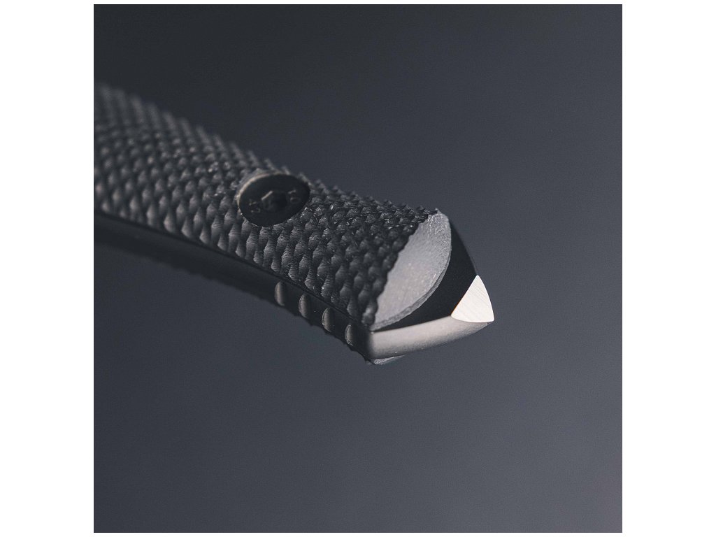 Fekete G10 markolat agresszív textúrával és fogazással a peremén, ami biztos fogást biztosít kesztyűben, még nedves környezetben is. A markolat tüskével van ellátva, amely hasznos lehet üveg vagy más anyagok töréséhez.