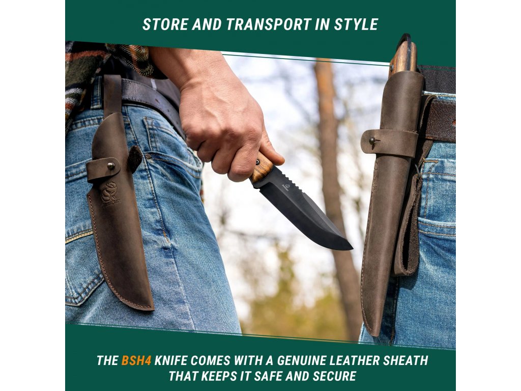 A penge kiváló minőségű, 1066 típusú szénacélból készült, 58-60 HRC keménységűre edzett, 12,5 cm hosszú, 3,5 cm széles és 3,5 mm vastagságú, drop pointy alakú. A markolat fából készült, európai diófából készült, sötétbarna színű, amely a fekete pengével kombinálva nagyon esztétikus és elegáns benyomást kelt. Hossza 12,5 cm, ami kiegészíti a kés 25 cm-es teljes hosszát. A késhez egy paracord zsinór és egy valódi bőr tok tartozik övhurokkal, hogy új BSH4 társa mindig kiváló állapotban és mindig kéznél legyen.