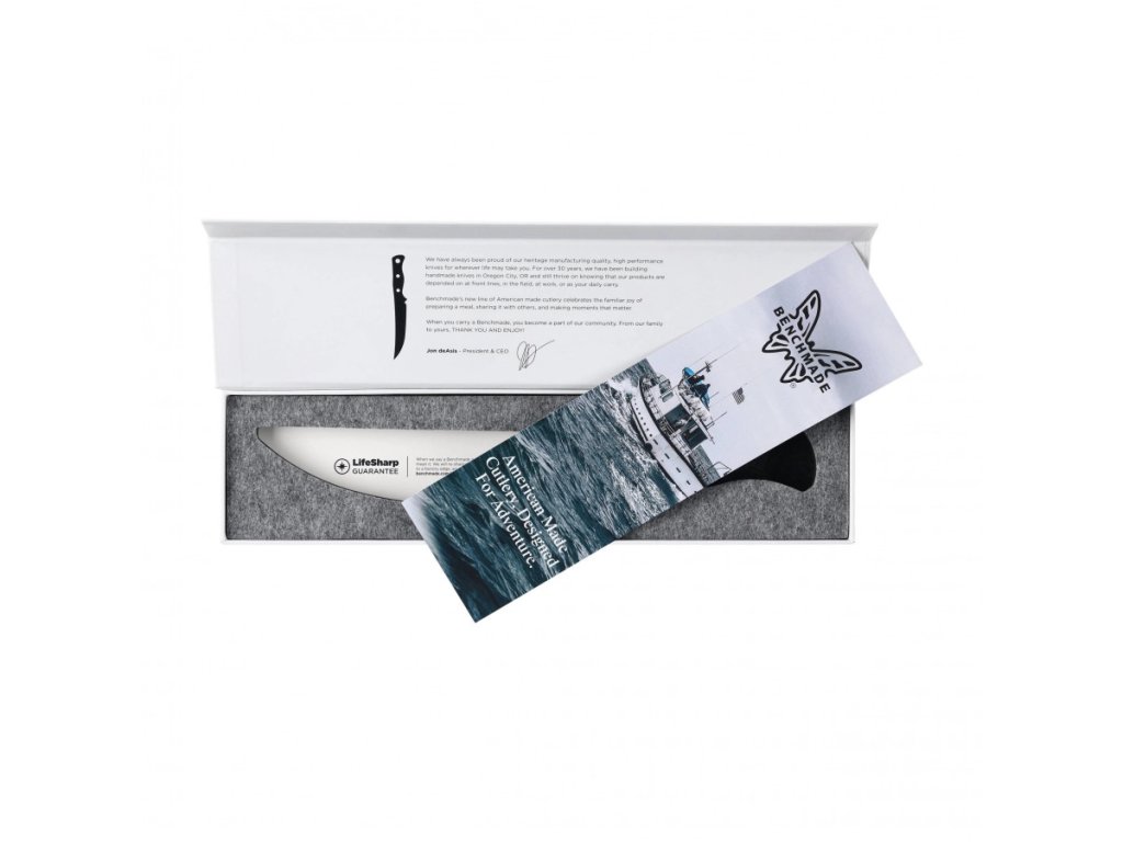 A kés elegáns díszdobozban érkezik, valamint szürke műanyag tokkal, amely megbízhatóan védi a pengét szállítás és tárolás közben.