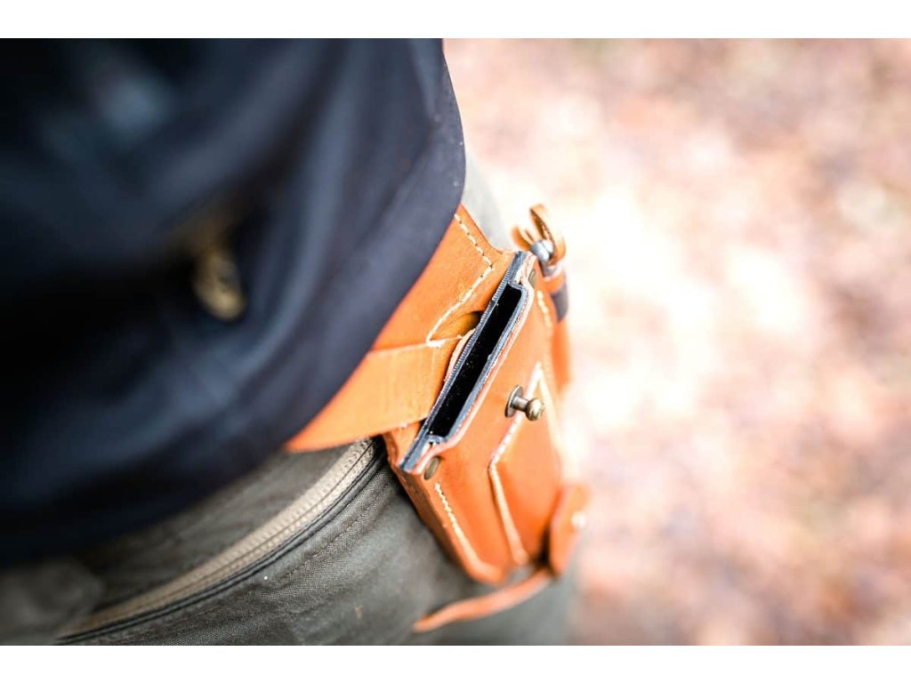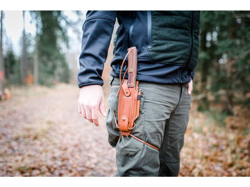 A késhez tartozik egy bőrtok, egy fenőkő és egy acél tű. A tok viselhető függőlegesen és vízszintesen is.