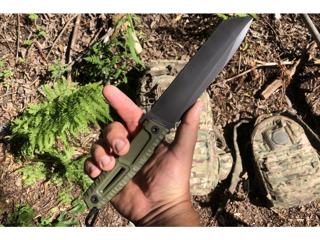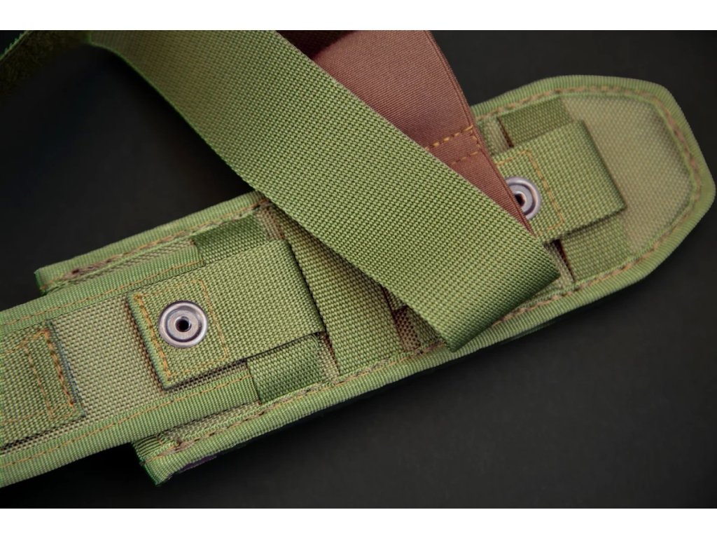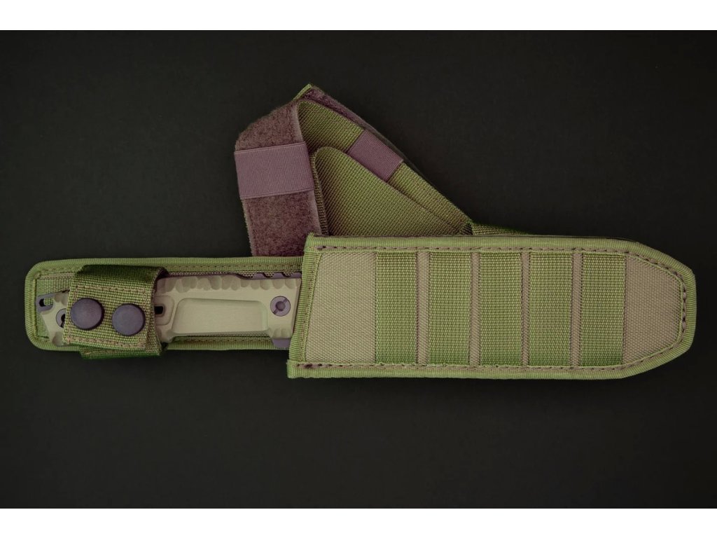 A kés zöld Molle rendszerű tokkal érkezik, mely alkalmas taktikai mellényeken és öveken való hordásra.