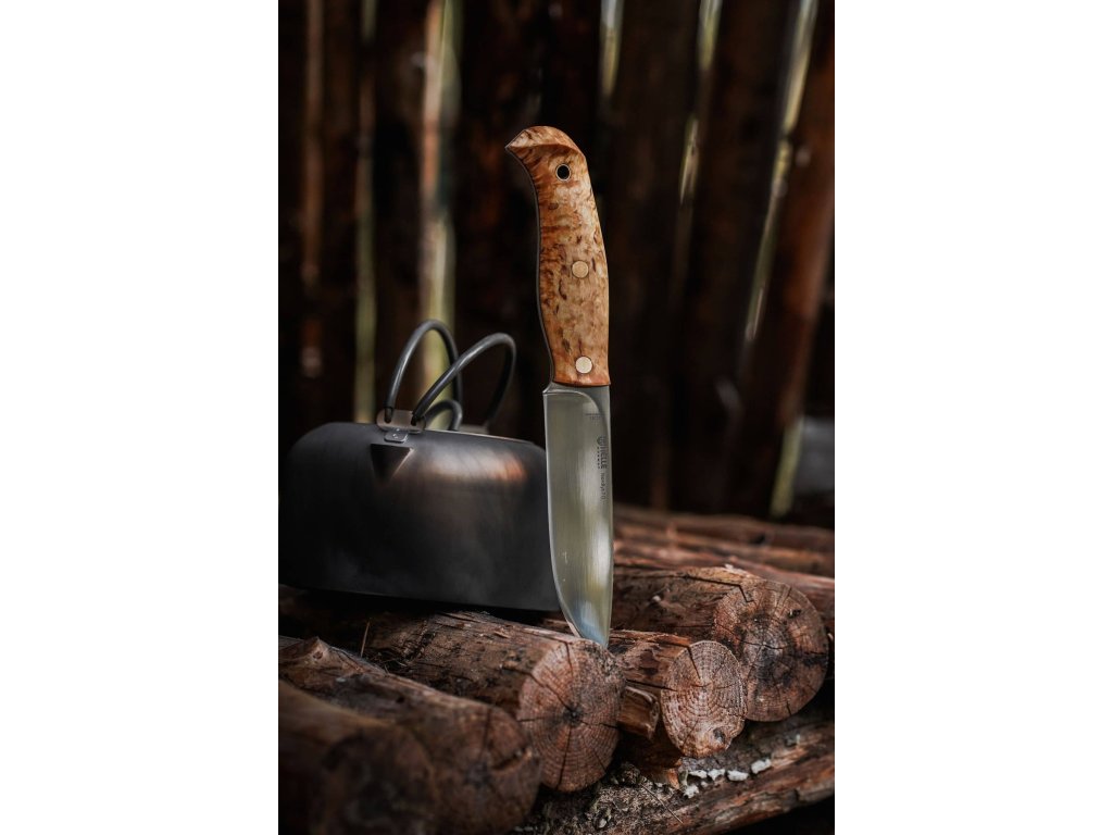 A Helle Nordlys Flatgrind (FG) természetjáró kés könnyűsége miatt kiemelkedő. Mindössze 100 g (tokkal együtt 188 g) súlyával ideális társ a kempingezéshez és egyéb kültéri tevékenységekhez. A Sandvik 12C27 rozsdamentes acélból készült penge hossza 12,2 cm, lapos élezéssel és 2,1 mm vastagsággal rendelkezik. Ezért inkább vágásra és szeletelésre alkalmas, mint komolyabb bushcraft feladatokra. A göndör nyírfából készült markolat kényelmes fogást biztosít. A csomagolás tartalmaz egy bőrtokot, mely övre akasztható.