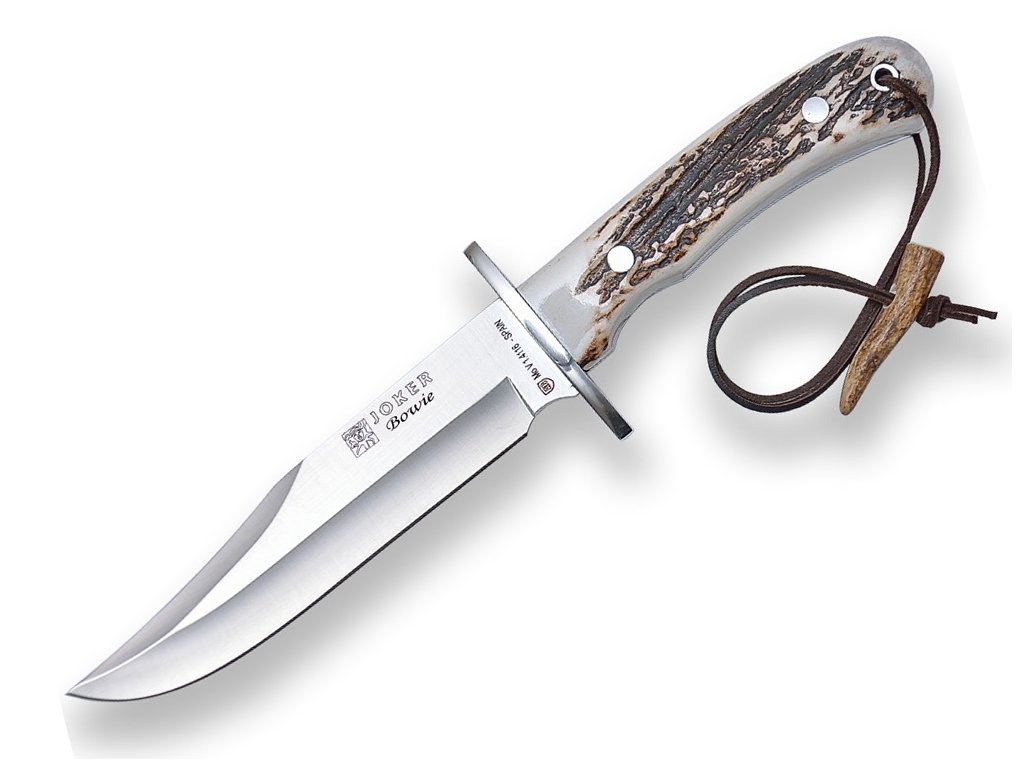 A Joker Bowie CC96 egy nagyobb vadászkés szarvasagancs markolattal. A 16 cm hosszú, clip point alakú penge 1.4116 rozsdamentes acélból készül, matt felületkezeléssel. A kést prémium barna bőrtokkal együtt szállítjuk. A kés markolatának hátulján van egy kisebb lyuk a madzag felakasztására. Ha szereted a szabadban, és szereted a hétvégéket a természetben tölteni, a Joker Bowie kés nem hiányozhat a felszerelésedből. A kés teljes egészében Spanyolországban készült.