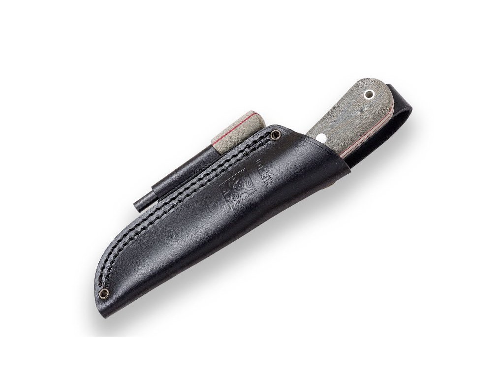A késhez tartozik egy kiváló minőségű bőrtok, amely magasan vagy alacsonyan az övre akasztható, valamint egy szikravető.
