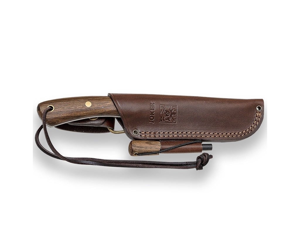 Erdőkés A Joker Nessmuk CN136-P egy közepes méretű bushcraft kés full tang konstrukcióval (egy darab acélból készült). A Sandvik 14C28N rozsdamentes acél penge matt felületkezeléssel 11 cm hosszú. A diófa markolat igazi dísze ennek a késnek. Egy skandináv szabású erdei kés nagyszerű társ lesz minden szabadtéri kiránduláshoz. A csomag tartalmaz egy bőr tokot tömör varrással. Ezenkívül a tok lehetővé teszi a függőleges felfüggesztés magasságának beállítását (alacsony/magas), így az aktuális helyzetnek megfelelően könnyedén változtatható. A csomag tartalmaz egy szikravetőt is, amit a tokban tárolhatsz a késsel együtt. A kés teljes egészében Spanyolországban készült.
