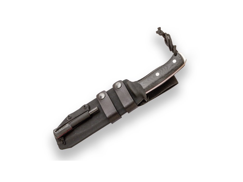 A fekete micarta markolat nagyon kényelmes fogást biztosít, amit különösen hosszabb vadonban töltött idő során fogsz értékelni. A csomag tartalmaz egy kydex tokot alacsony és magas hordási lehetőséggel, egy tűzgyújtót, egy tükröt és egy paracord zsinórt.