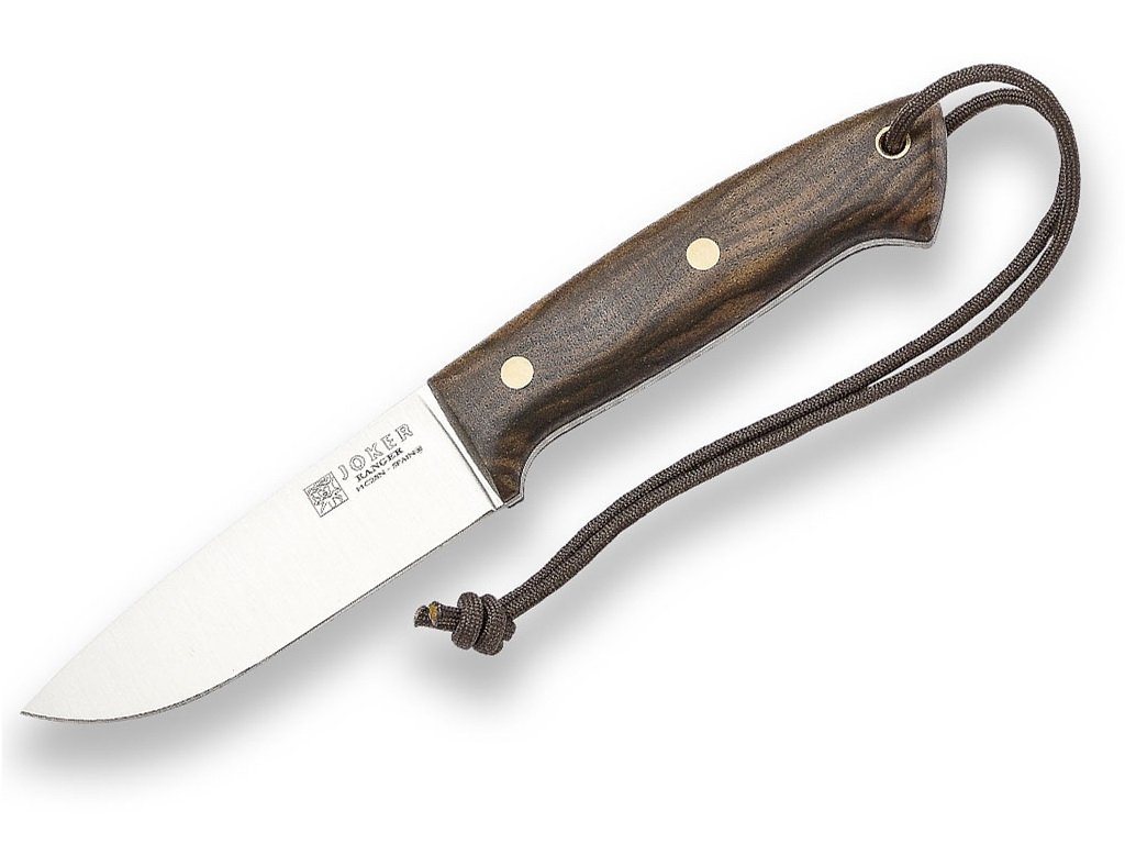 A Joker Ranger CN144 egy közepes méretű bushcraft kés, amely ideális választás az erdőbe és természetbe. Teljes tang kialakítású (egy darabból készült acélból), 11 cm hosszú pengéje rozsdamentes Sandvik 14C28N acélból készült, szatén felületkezeléssel. A diófából készült markolat természetes és elegáns megjelenést kölcsönöz a késnek. A csomag tartalmaz egy barna bőrtokot és egy paracord zsinórt is.