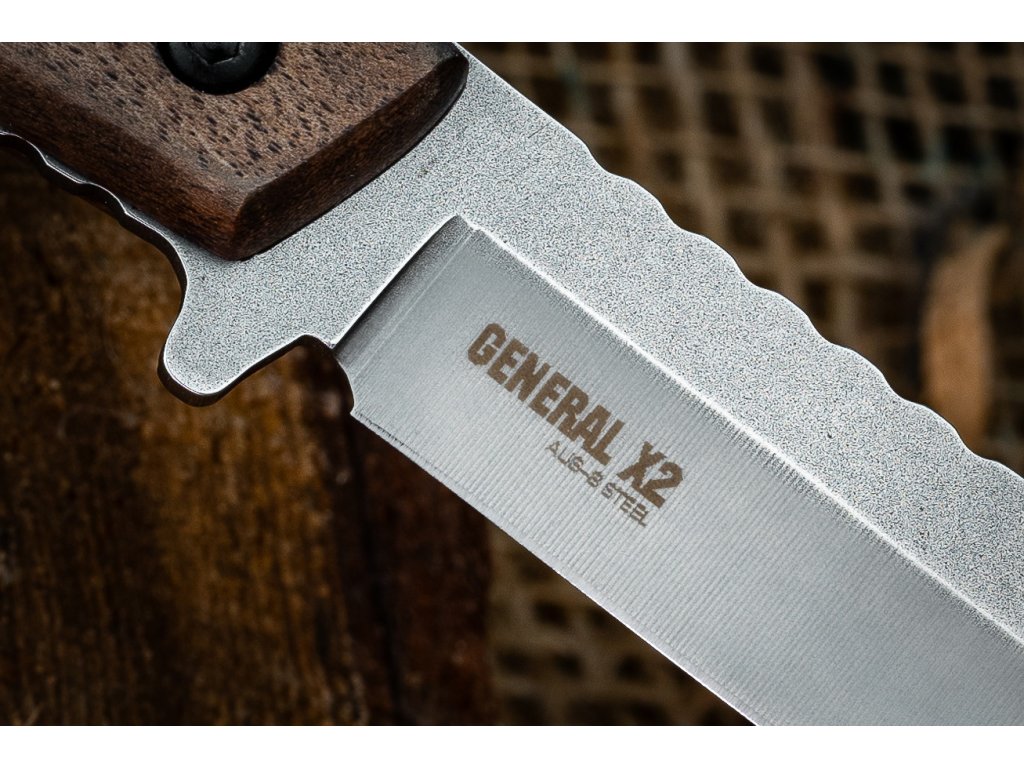 A RedSteel General X2 egy egyszerű túra-, munka- és vadászkés hosszú, keskeny pengével. A penge AUS-8 rozsdamentes acélból készült, keménysége 58 - 59 HRC. Az AUS-8 acél nem igényel különleges ápolást, könnyen élezhető és ellenáll a pengetörésnek. A 14 cm hosszúságú pengével a kés kiválóan alkalmas túrázáshoz, ház körüli munkákhoz és vadászkésként is jól használható. A 2,9 mm-es pengevastagság kellő szilárdságot biztosít a késnek, és az üreges csiszolással együtt kiváló vágási tulajdonságokat is biztosít.