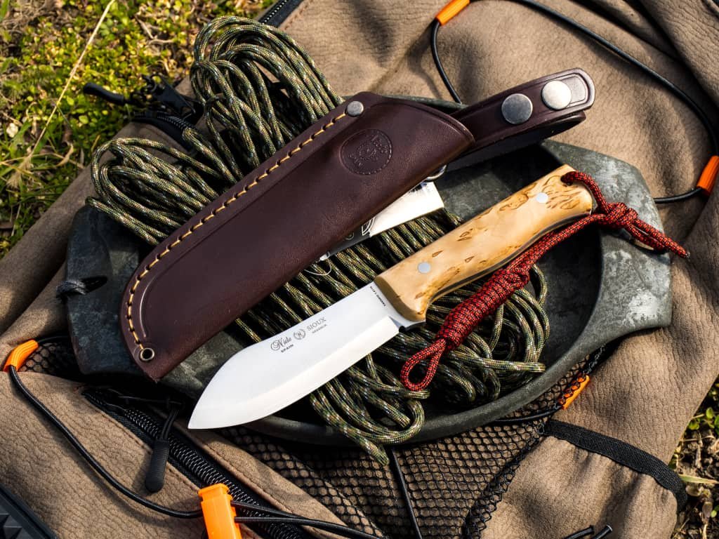 A Nieto Sioux egy kiváló minőségű, masszív, közepes méretű kés, amely alkalmas a természetbe és a vadászathoz. A full tang konstrukció garantálja annak szilárdságát és megbízhatóságát. A nessmuck alakú penge 11,3 cm hosszú, skandináv élezésű és német 1.4116-os rozsdamentes acélból készült. Göndör nyírfa nyél. Erős varrással ellátott marhabőr tok, amely lehetővé teszi az öv magas és mély lógását. A kés kompatibilis szikravetővel.