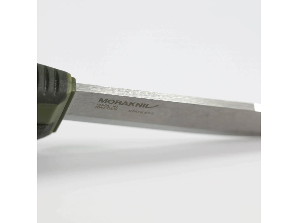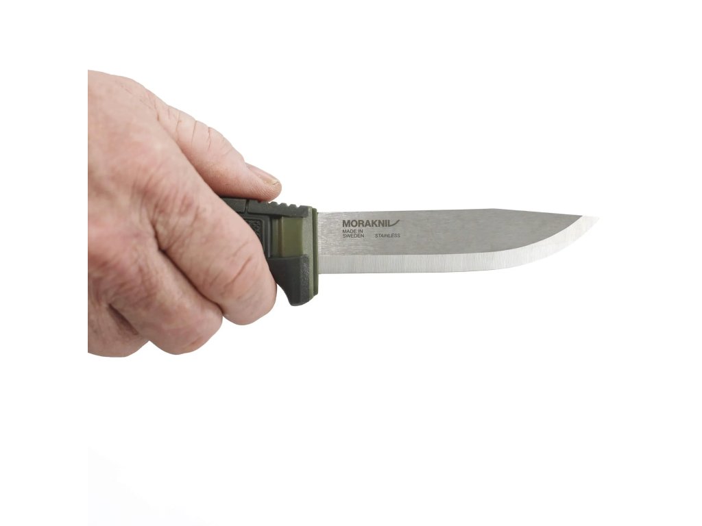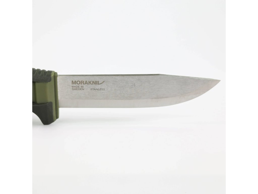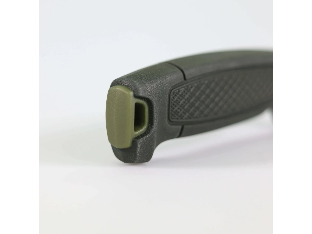 Az egyik innovatív elem a markolat, amely laposabb a klasszikus Mora outdoor késekhez képest. A háromrészes konstrukció polipropilén magot és külső TPE (szilárd termoplaszt) réteget kombinál. A markolaton csúszásmentes felület található, a végén pedig paracord nyílás (lanyard hole). A Deep Forests szín sötétzöld, szinte fekete árnyalattal.