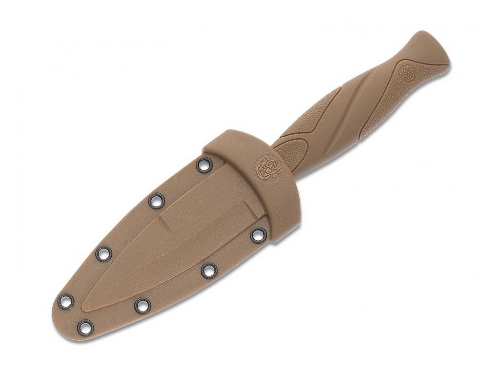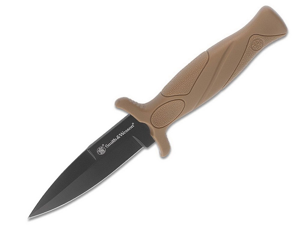 Intelligens és könnyen hordozható FDE indítókés aSmith & A rögzített pengével ellátott Wesson mindössze 64 grammot nyom és mindössze 16 cm-es. Ezeknek a paramétereknek köszönhetően a kés akkor sem csökkenti a kényelmet, ha Ön folyamatosan mozgásban van. Ez egy úgynevezett bakancskés – cipőben vagy cipőn való szállításra alkalmas kés.A kés pengéje Spear Point alakú, egyoldalas és lapos élezéssel. A pengéhez használt anyag megbízható és megfizethető 8Cr13MoV rozsdamentes acél. A markolat a védőnek köszönhetően ujjvédelmet nyújt, gumival bevont műanyagból készült a biztosabb fogás és a gyors húzás érdekében. A késhez tartozik egy műanyag tok, amelyen csíptető van akasztáshoz.