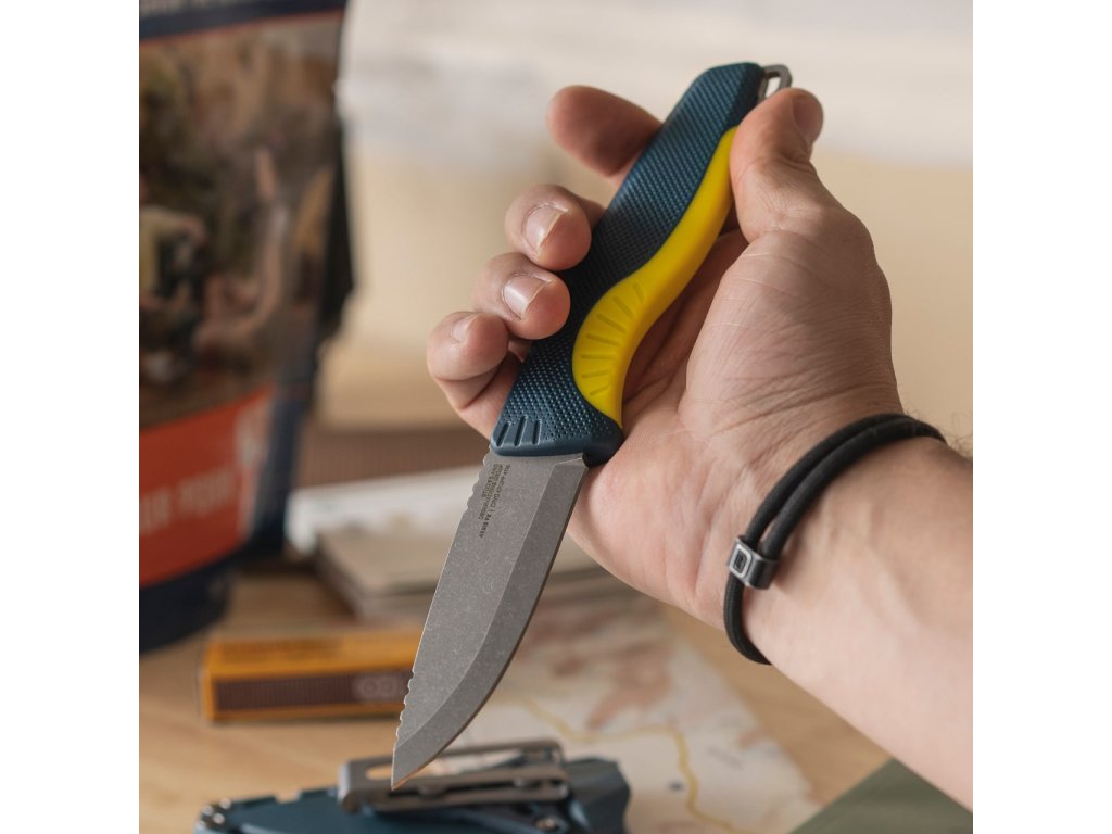 Az Aegis FX egy fix pengéjű kés, amely megbízható társ bármilyen kültéri kihíváshoz, és egy darabban végzi el a munkát. A tartós CRYO 4116 Krupp rozsdamentes acélból készült full-tang pengéje ellenáll a korróziónak és hosszú ideig megőrzi élességét. A penge drop point alakú, stonewash kivitelű, 9,4 cm-es, 3,6 mm vastagságú. A kés teljes hossza 22 cm, súlya 133 g. Az összes rögzítési rendszerrel kompatibilis, testre szabható tokkal számos hordozási lehetőséget kínál. Az ergonomikus gumírozott felülettel ellátott GRN markolat kényelmes fogást biztosít, amely különböző tartási módok esetén is kényelmet biztosít, és ezért jól manőverezhető. A kés indigósárga színű kivitelben készül. A késhez egy UMS kemény műanyag tok tartozik.