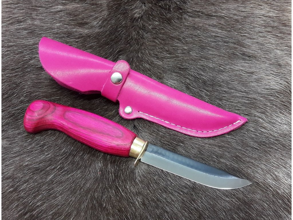 Wood Jewel Partiopuukko - cserkészkés. Egy kisebb hagyományos skandináv kés 8,5 cm hosszú pengével 80CrV2 szénacélból, mely kiemelkedően nagy szívóssággal rendelkezik. A rózsaszín színű rétegelt lemez markolat jellegzetes sárgaréz újjvédővel rendelkezik, amely megakadályozza, hogy a kéz rácsússzon a pengére. A késhez bőrtok jár.