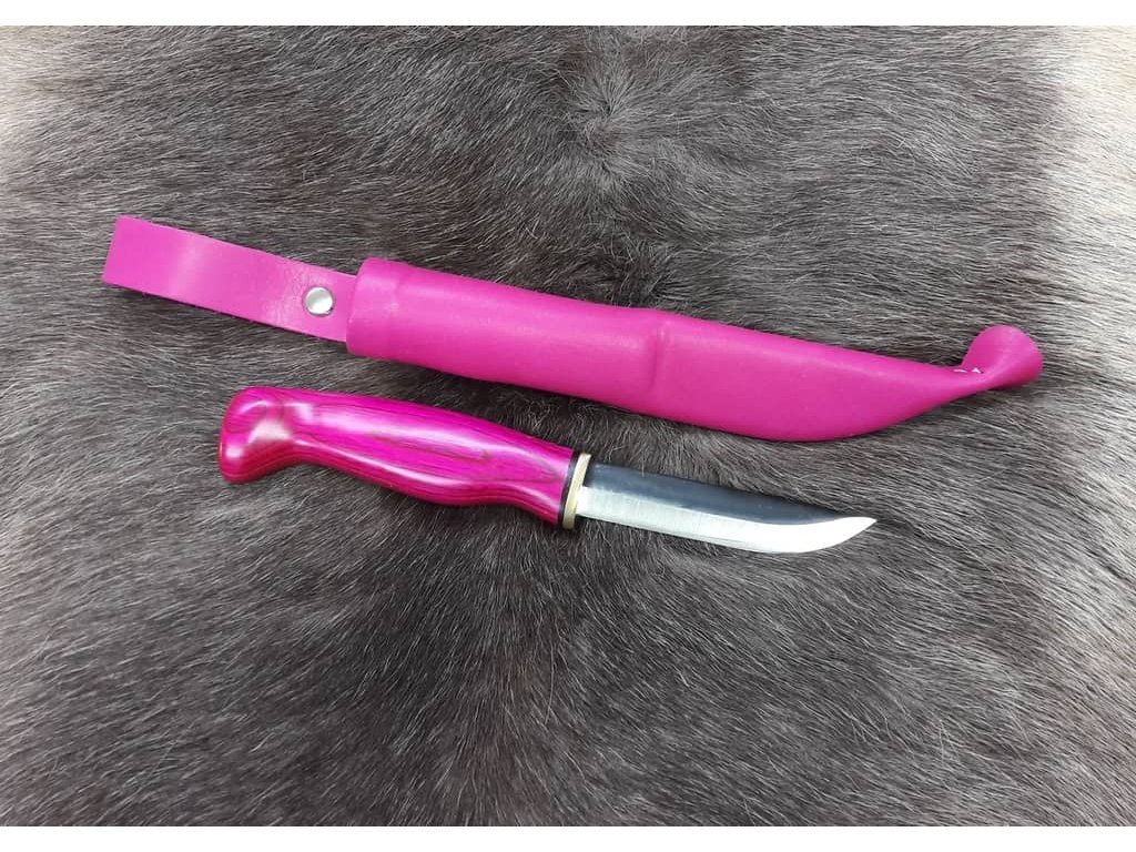 Hagyományos skandináv puukko kés jellegzetes rózsaszín színben. A 8,5 cm hosszú penge 80CrV2 szénacélból készült, skandináv élezésű és nagyon éles. A 80CrV2 acél szívósságával tűnik ki, ami ideálissá teszi a természetben való használatra. A rózsaszín színű rétegelt lemez markolatja ergonomikus kialakítású és kényelmesen fogható. A késhez bőr tok jár.