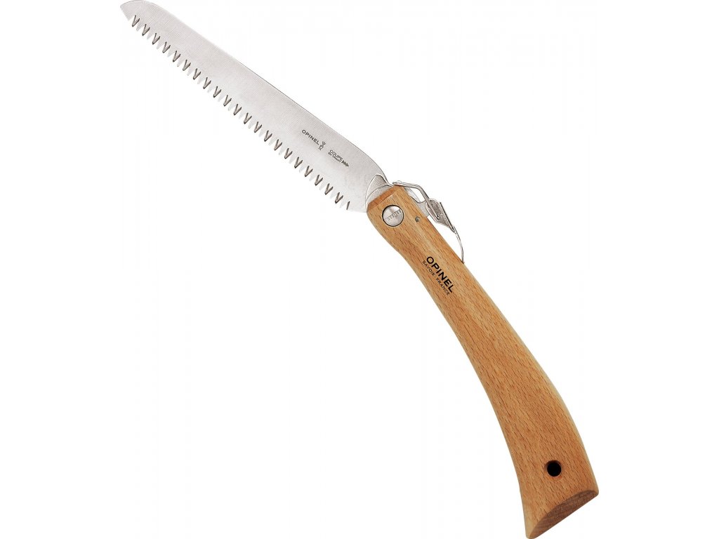 Praktikus összecsukható fűrész a francia Opinel márkától, 18 cm-es rozsdamentes acélpengével és bükkfából készült markolattal, alkalmas vékonyabb ágak vágására, a házkörüli vagy a kerti munkához.