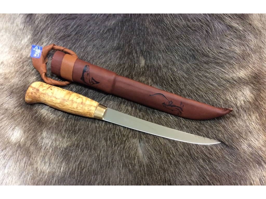 A Wood Jewel Fileerausveitsi filézőkés ideális kés közepes és nagy halak filézéséhez. A penge rozsdamentes acélból készült, és megfelelő rugalmassággal rendelkezik, hogy megkönnyítse a filézést. Ennek az acélnak a lágyabb természete lehetővé teszi, hogy a penge törés nélkül meghajoljon, és könnyedén siklik a tökéletes filézéshez. Göndör nyírfa nyél sárgaréz kivitelben. Bőr tok hal motívummal.