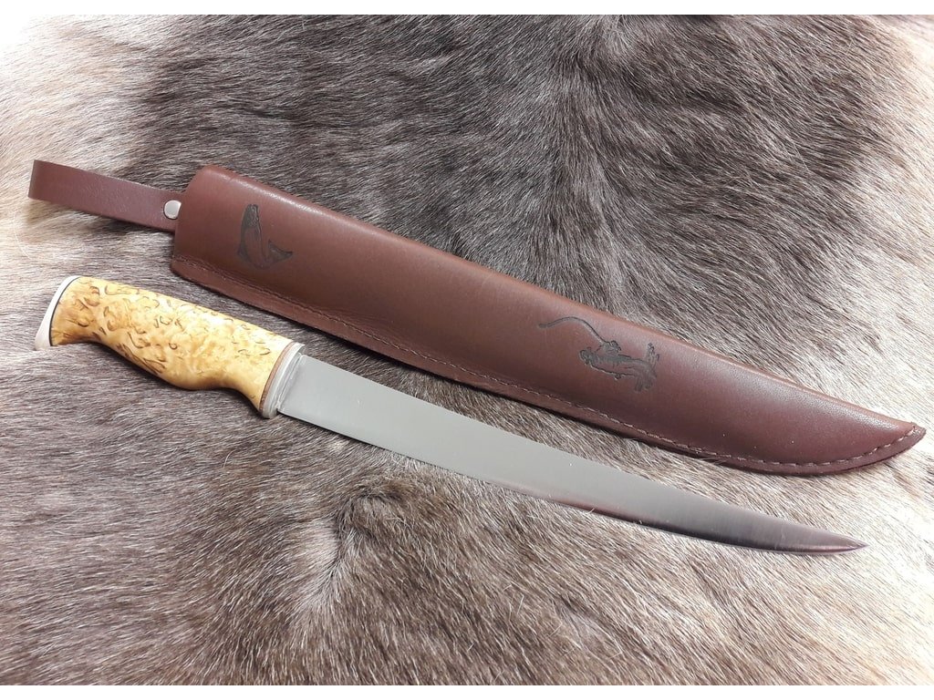 A Wood Jewel Fileerausveitsi filézőkés ideális kés közepes és nagy halak filézéséhez. A penge 22 cm hosszú, rozsdamentes acélból készült, és megfelelő rugalmassággal rendelkezik, hogy megkönnyítse a filézést. Ennek az acélnak a lágyabb természete lehetővé teszi, hogy a penge törés nélkül meghajoljon, és könnyedén siklik a tökéletes filézéshez. Göndör nyírfa nyél és rénszarvas agancs. Bőr tok hal motívummal.