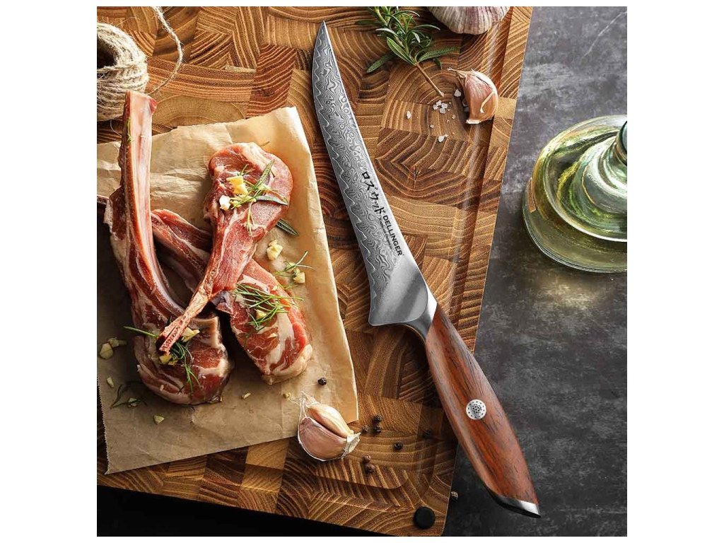 A rendkívül éles Dellinger Rosewood Boning Damascus csontozókés elsősorban hús csontozására és gyors feldolgozására lett tervezve. A japán stílusú, keskeny penge damaszkuszi acélból készült, és 19 cm hosszú éllel rendelkezik. Ha nem szeretne hosszú órákat tölteni a hús előkészítésével, ez a kés megbízható segítőtársa lesz. Segítségével pillanatok alatt kicsontozhatja a húst, és könnyedén elbánik a zsíros vagy inas részekkel is. Tegye kellemesebbé a főzést, és próbálja ki a Dellinger konyhakések által nyújtott új élményt!