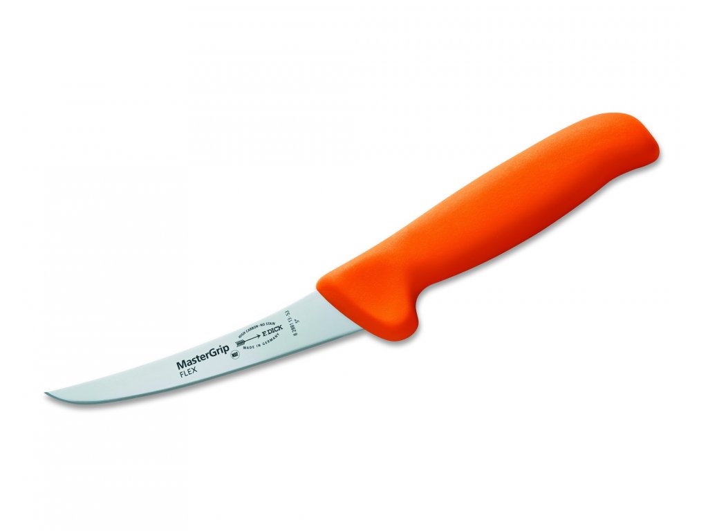 A Dick MasterGrip professzionális csontozó henteskés rugalmas, hajlított pengével egy közepes méretű kés, 13 cm-es pengehosszúsággal, húsfeldolgozáshoz használják . A kés pengéje X55CrMo14 erősen ötvözött, rozsdamentes német acélból készült, mely tulajdonságainak köszönhetően a konyhai kések gyártásában is népszerűvé vált. Ez az acél nagyon szívós és jól ellenáll a korróziónak. Ha nem szeretne túl gyakran bajlódni a kés karbantartásával, akkor ez egy kiváló választás az Ön számára, mert könnyen élezhető. A narancssárga színű, teljesen műanyag nyél a kezek formájához és különböző méretéhez igazodik, hogy a kést biztonságosan és kényelmesen lehessen használni egész munkanapon. A kiváló minőségű műanyagnak köszönhetően a kés nem csúszik, ami pontosságot és egyben nagyobb hatékonyságot biztosít
