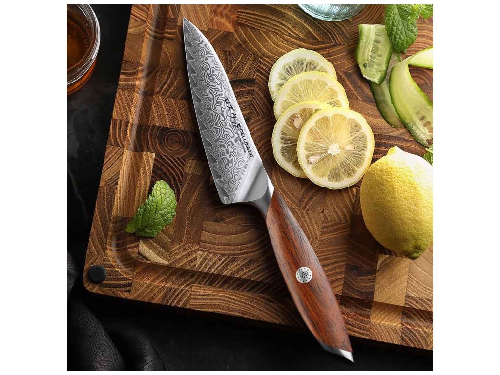 Az extrém éles Dellinger Rosewood Petty Damascus kés tökéletes segítő a hozzávalók szeletelésében, vágásában és tisztításában. A 13,5 cm hosszú masszív penge alkalmas a hús megtűzésére is. Biztosan hasznát veszi különféle gyümölcstálak vagy zöldségsaláták elkészítésénél, amikor igazán fontos a hibátlan formájúra vágott darabok létrehozása. Sokoldalúságának köszönhetően nem hiányozhat egyetlen jó konyhából sem. Tegye élvezetessé mindennapi szeletelését, és tapasztalja meg a Dellinger márkájú konyhakések nyújtotta új élményeket!