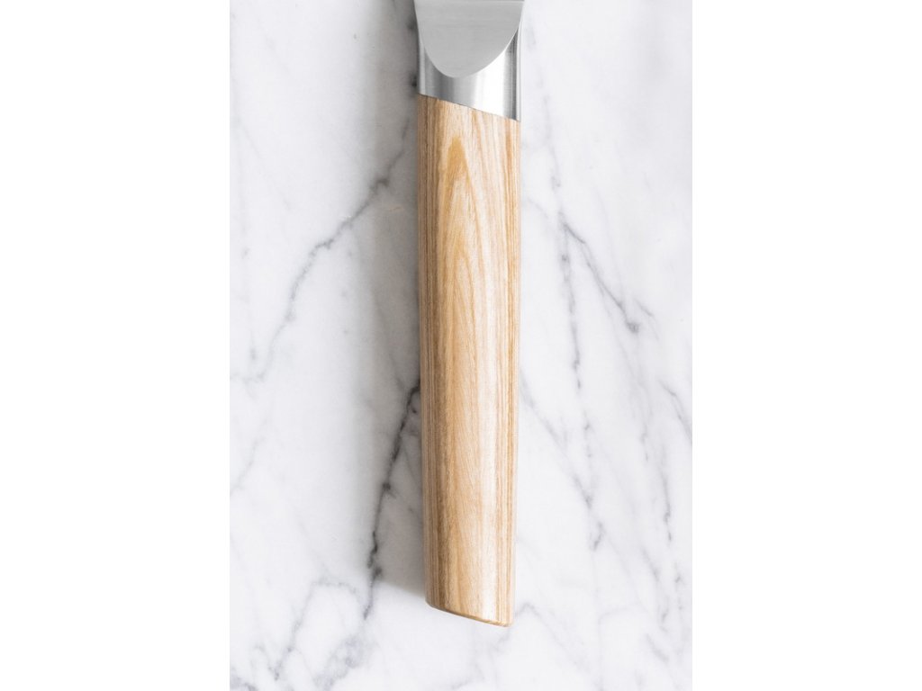 Az összetett, halvány pakka fából készült minimalista fa markolat szimmetrikus formájának köszönhetően jobb- és balkezes felhasználók számára egyaránt alkalmas. A fához kiváló minőségű gyantát adnak , hogy az anyag különösen ellenálló legyen a nedvességgel szemben, ami jobb stabilitást és hosszú élettartamot biztosít. A fém boleró biztosítja a nyél kényelmes és könnyű fogását a tokk- és mutatóujj között.