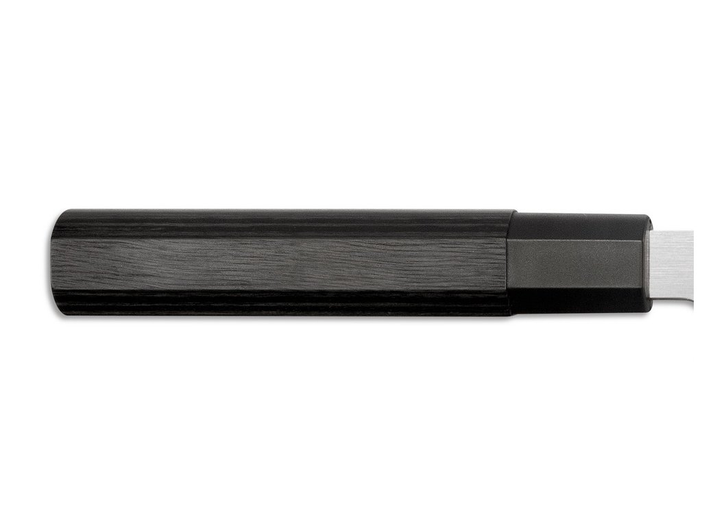 A kés hatszögletű markolata kompozit pakka fából készült, amelyet egy speciális eljárással kezeltek, és fokozott nedvességállóság, jobb stabilitás és tartósság jellemzi. A kést jobbkezes felhasználók számára tervezték.